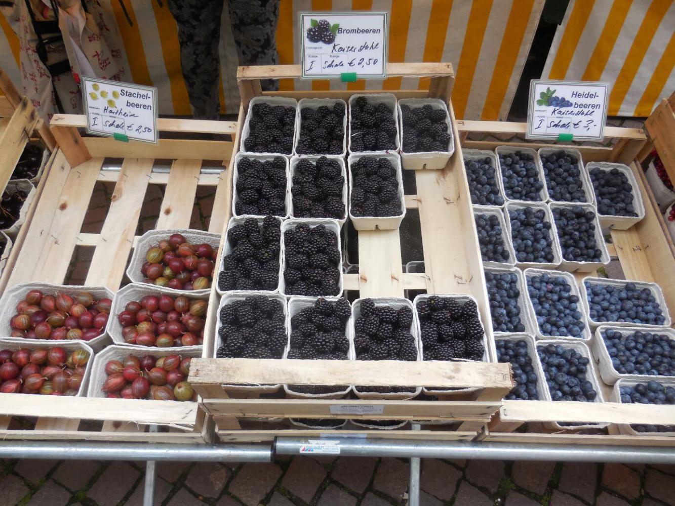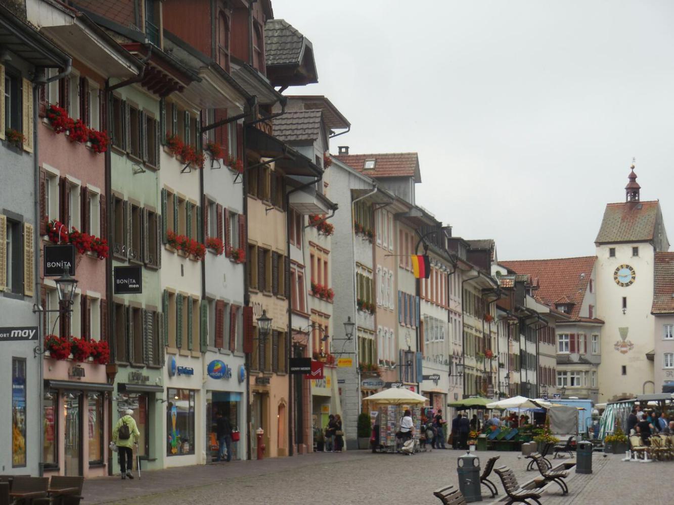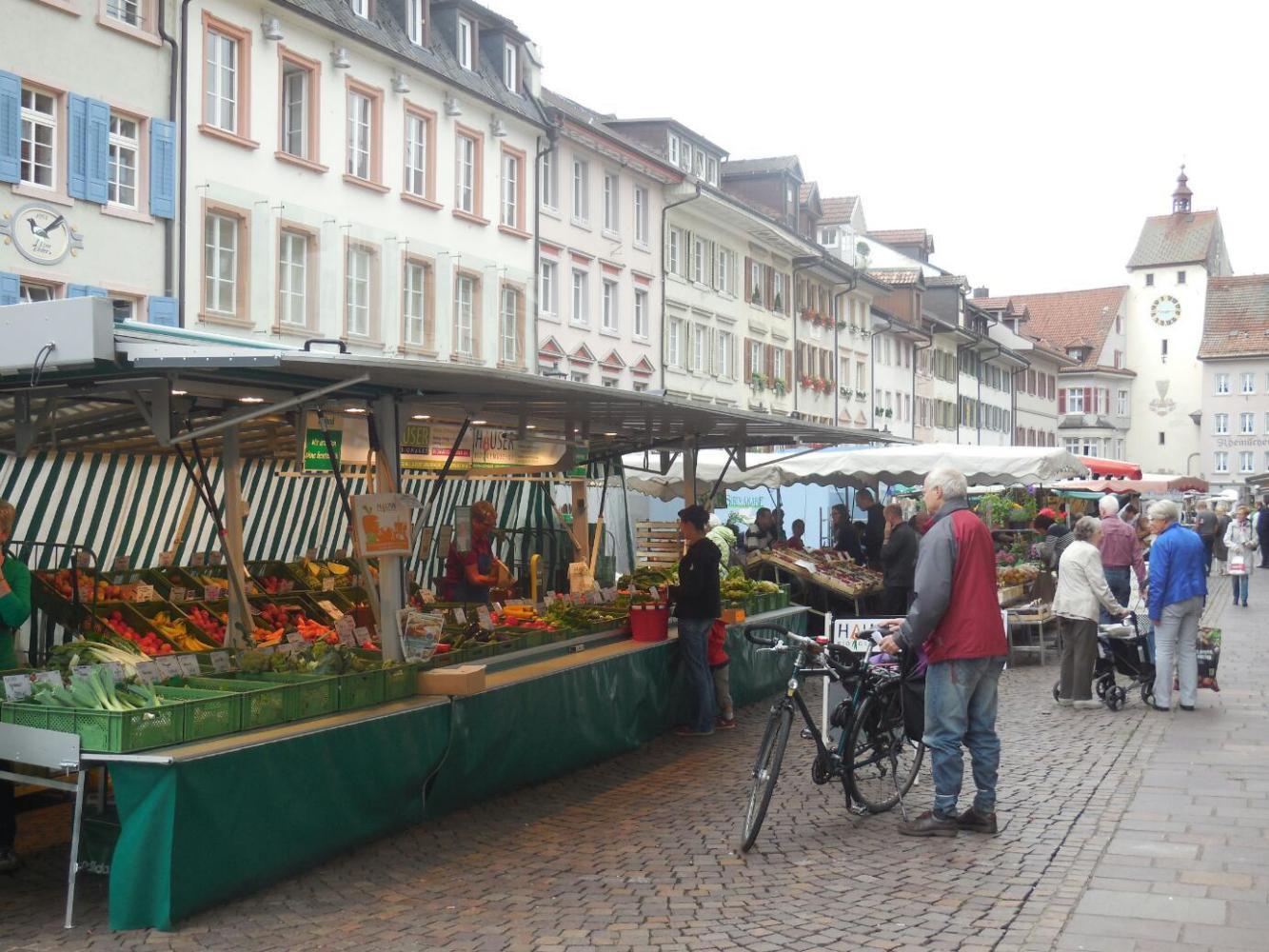 Waldshut is like Stein am Rhein - a couple of blocks of really nice buildings, entered by a gate. The buildings are four or five stories high, with many windows, featuring sills and often shutters. Many colours are used, with green, peach, and brown often seen. There was a market ongoing today, and peerhaps it is every day. Not a farmers' market, this one had the much loved (by us) cheese, bakery, fruit, and vegetable stands with local produce and some imports. like bananas and olives. We stocked up on bakery and fruit.