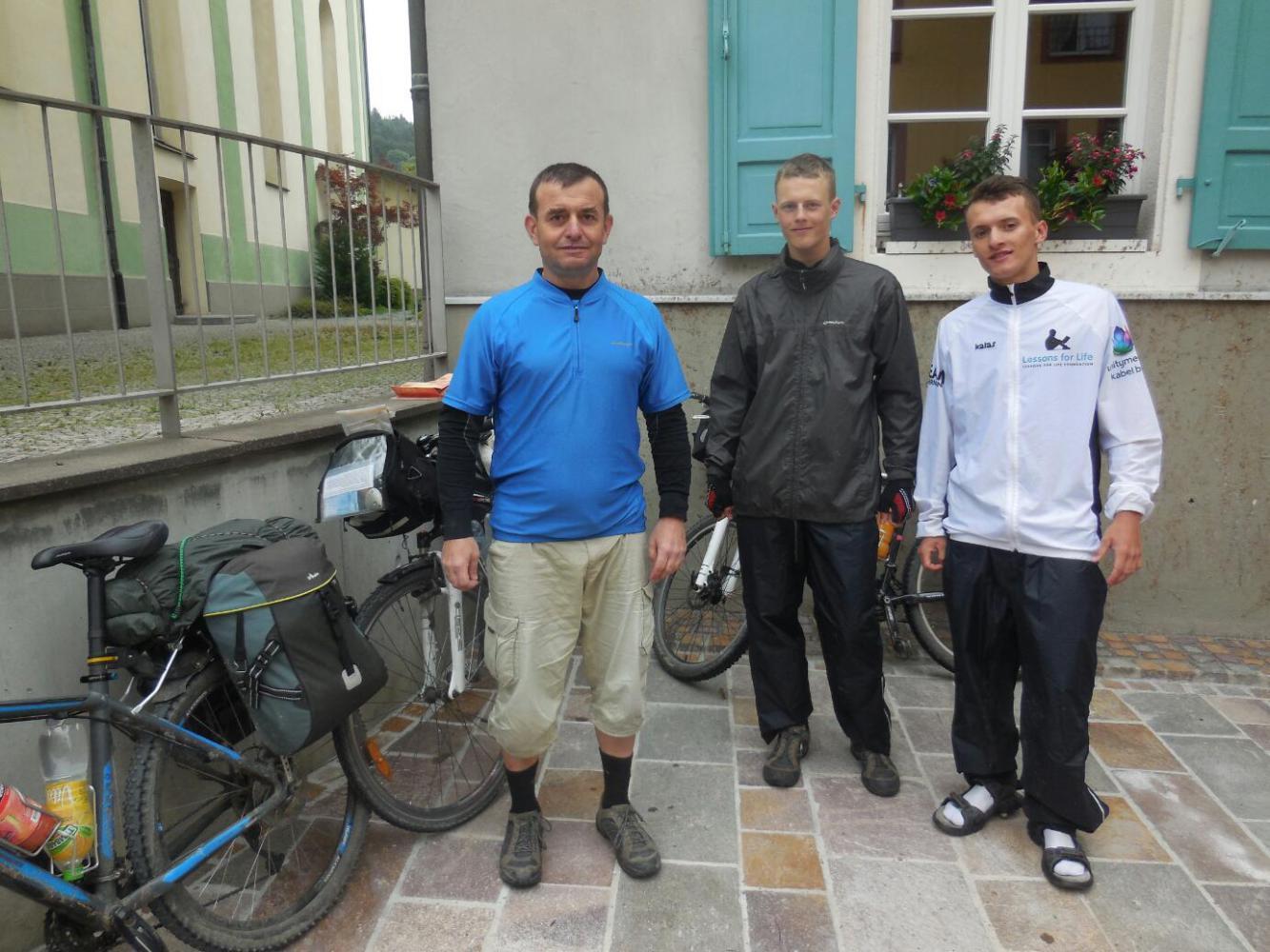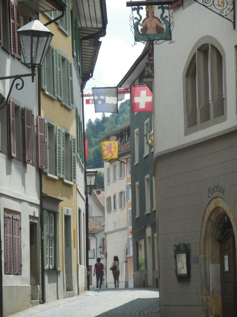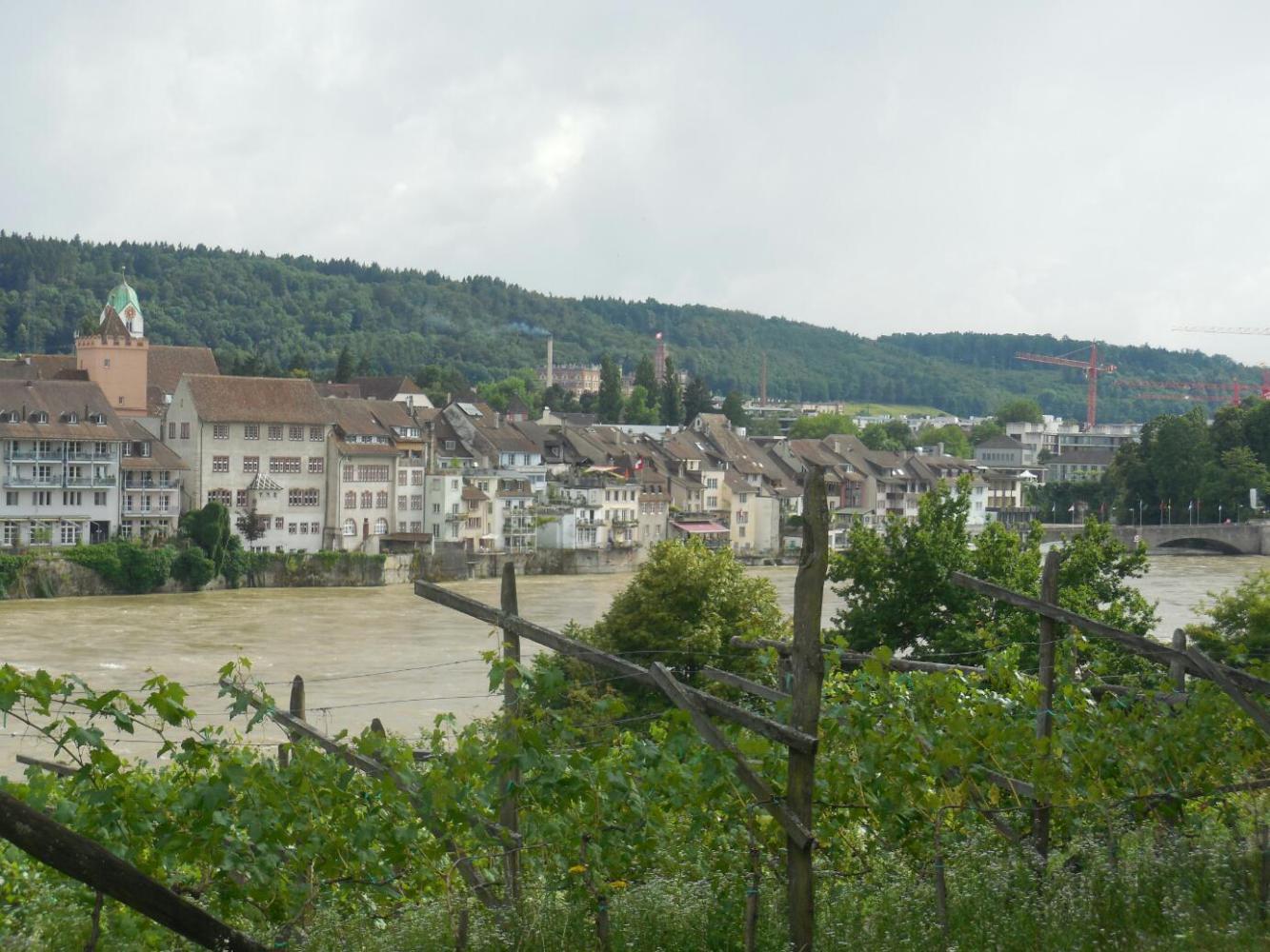 So , compromise. We cycled down into Swiss Rheinfelden to find a place to stay. Right over the bridge was the Hotel Schiff. Dodie went in - and came back a little shell shocked. They wanted 175 euros per night. However, standing across the street was Rosa, and the Hostel Beizli. This had hostel style cells with bunk beds, but a very serviceable communal lounge and kitchen. 80 euros (still not cheap!) got us our own room, with three beds, and shower and toilet across the hall. Our bikes could rest in the lounge. This met all our needs, and we are finding the hostel fun, with its kitchen - especially. Rosa was particularly friendly and helpful, and checked out train schedules on her laptop. So the plan is to train up to Freiburg to get together with Didier and Brigitte, and then train back down, to spend two or three days fighting our way back to Freiburg on the bikes again. We love this plan!
