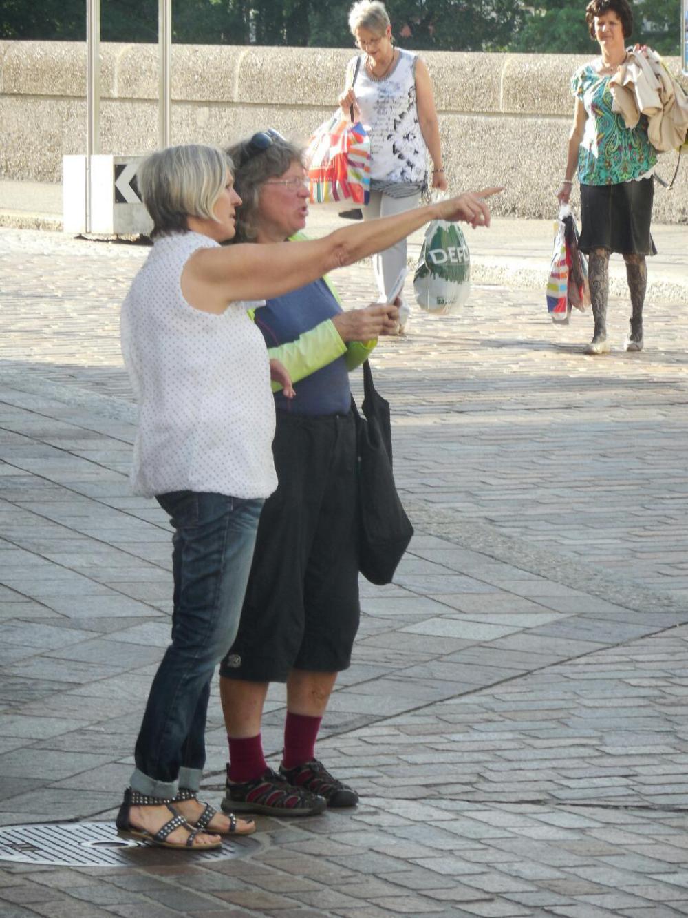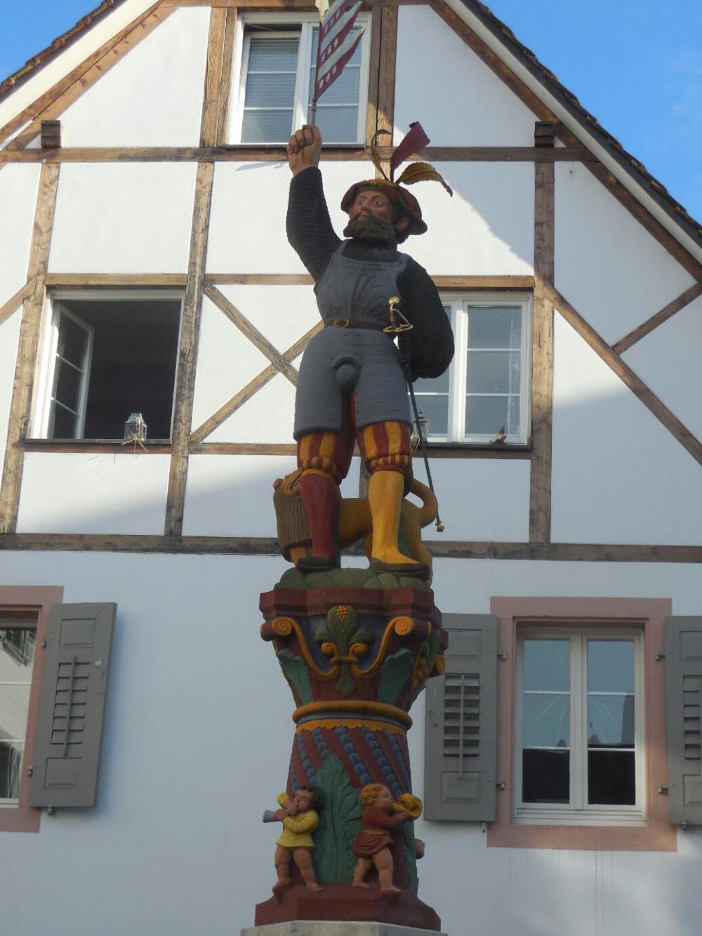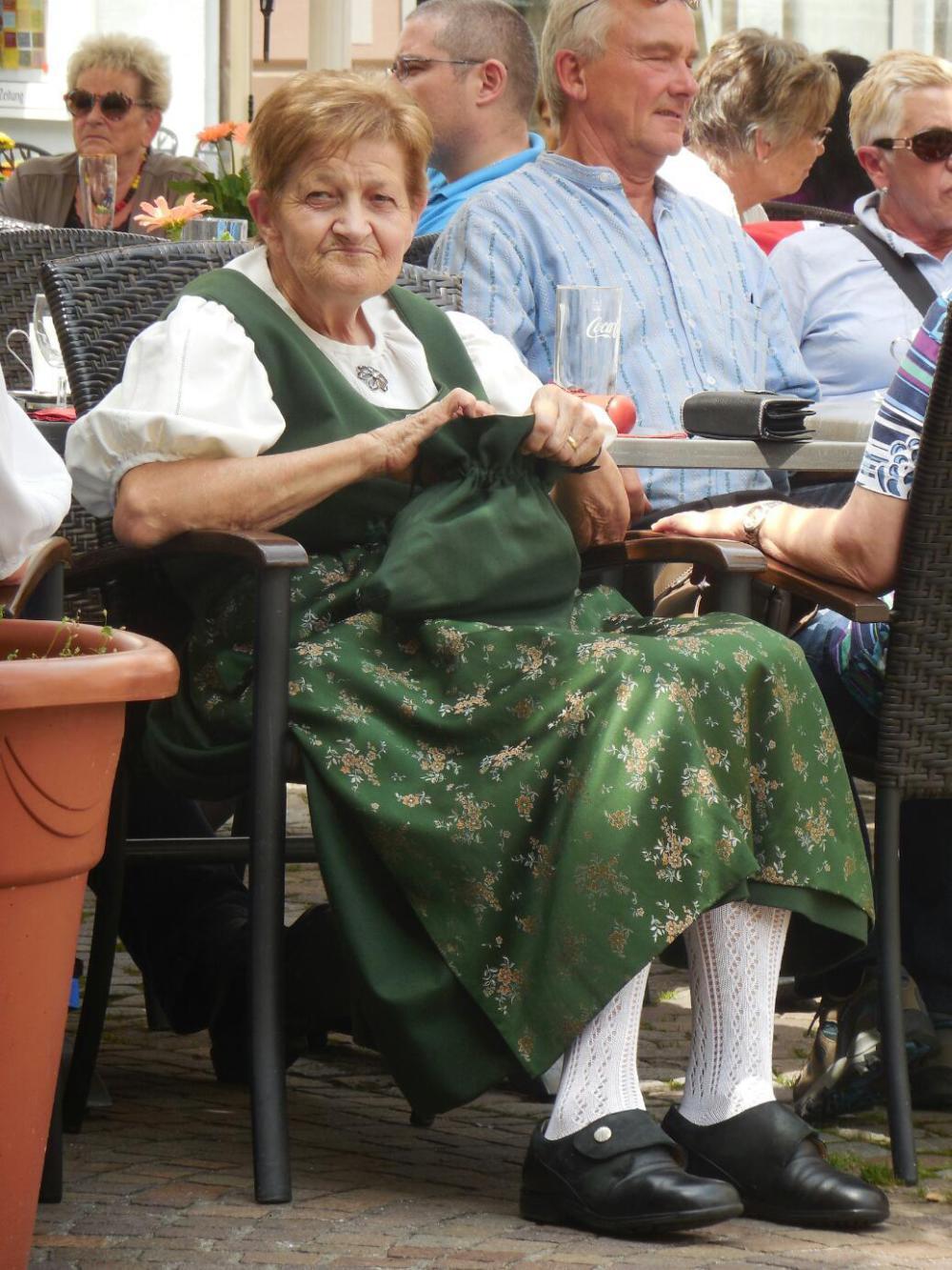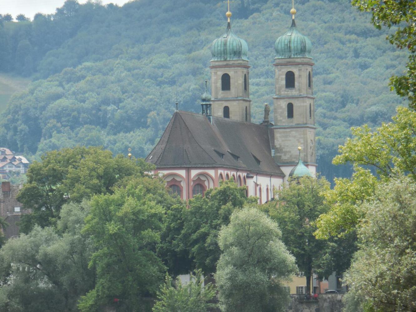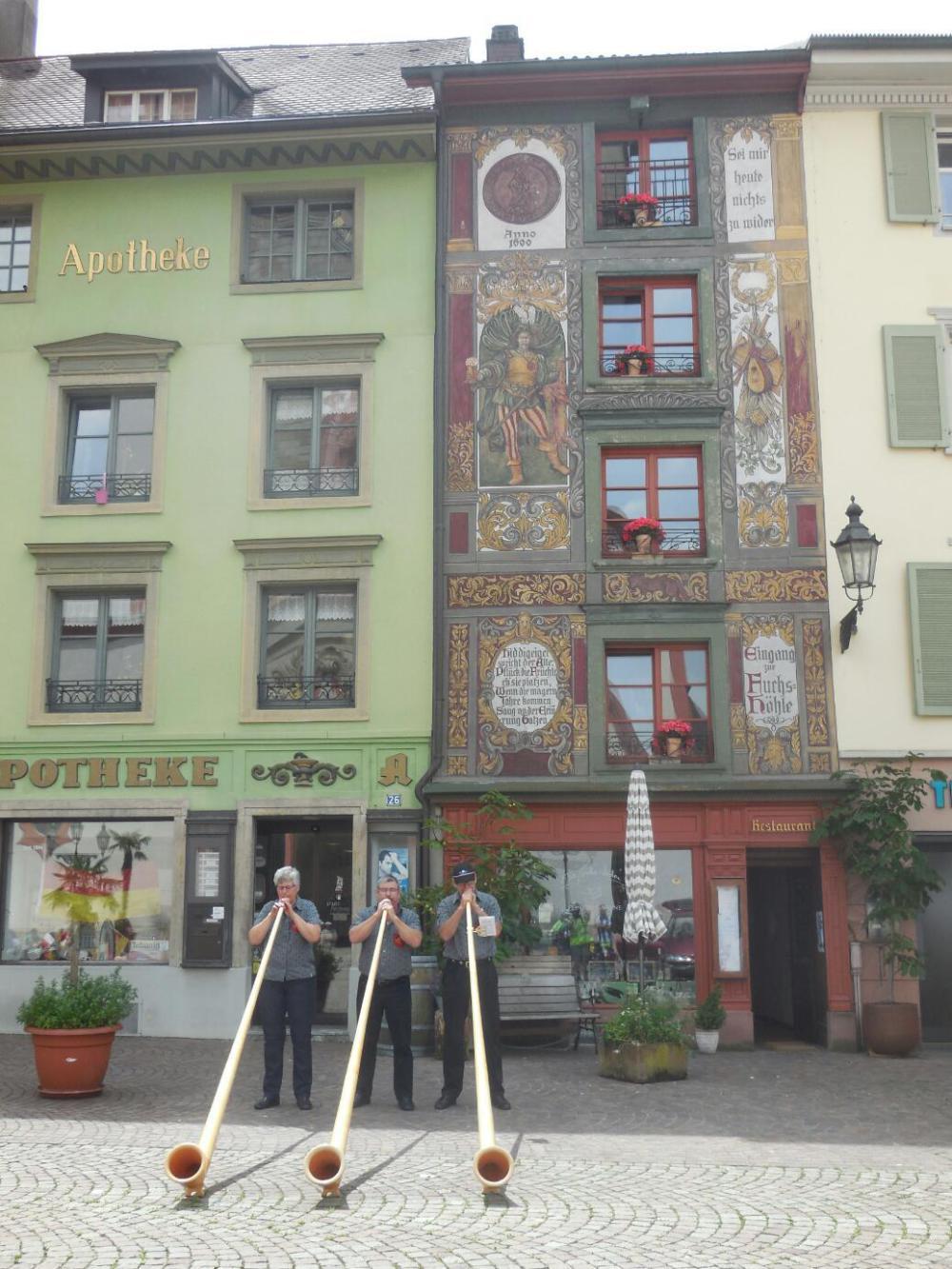 Bad Sackingen was the one that made the biggest impression. As we entered the town, bells chimed out in an exuberant outpouring. It turned out to be a wedding at the first church. We later found that we had missed the bride and groom in a decorated carriage. As we entered the market square we had a really big treat. Three alp horns were being played, in front of an elaborately frescoed building. This is the first time we have seen or heard these famous instruments. They were followed by a small group of men and women who sang in harmony, with the women breaking into a clear series of tones that I would call yodelling, though it did not quite have the "twang" fo some yodelling I may remember.
