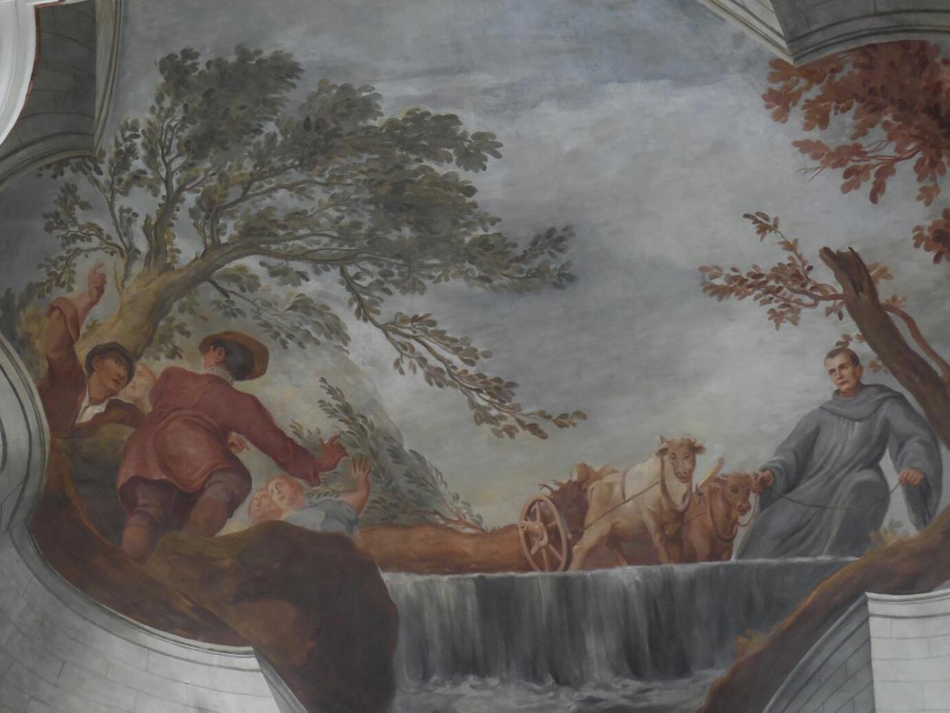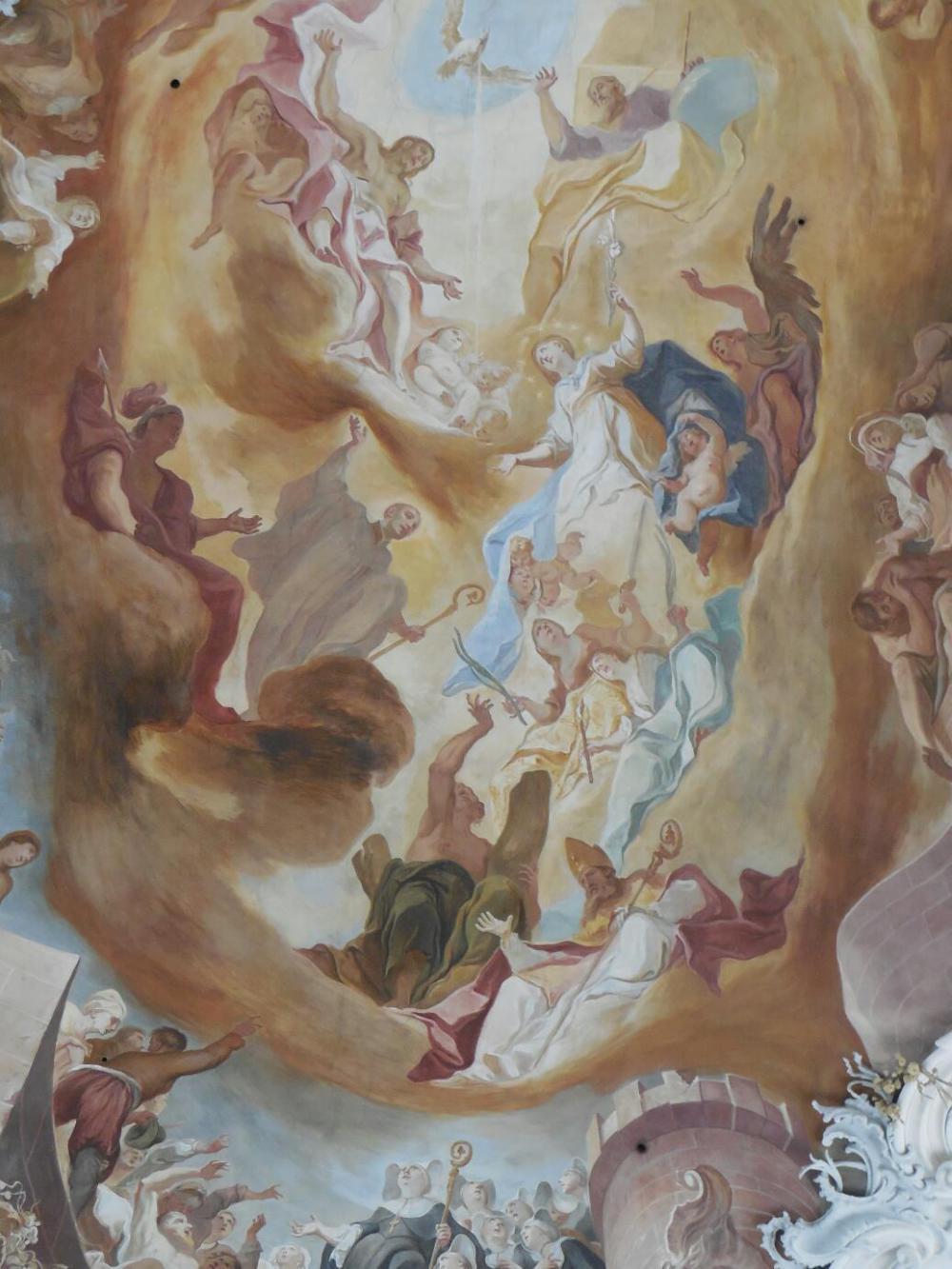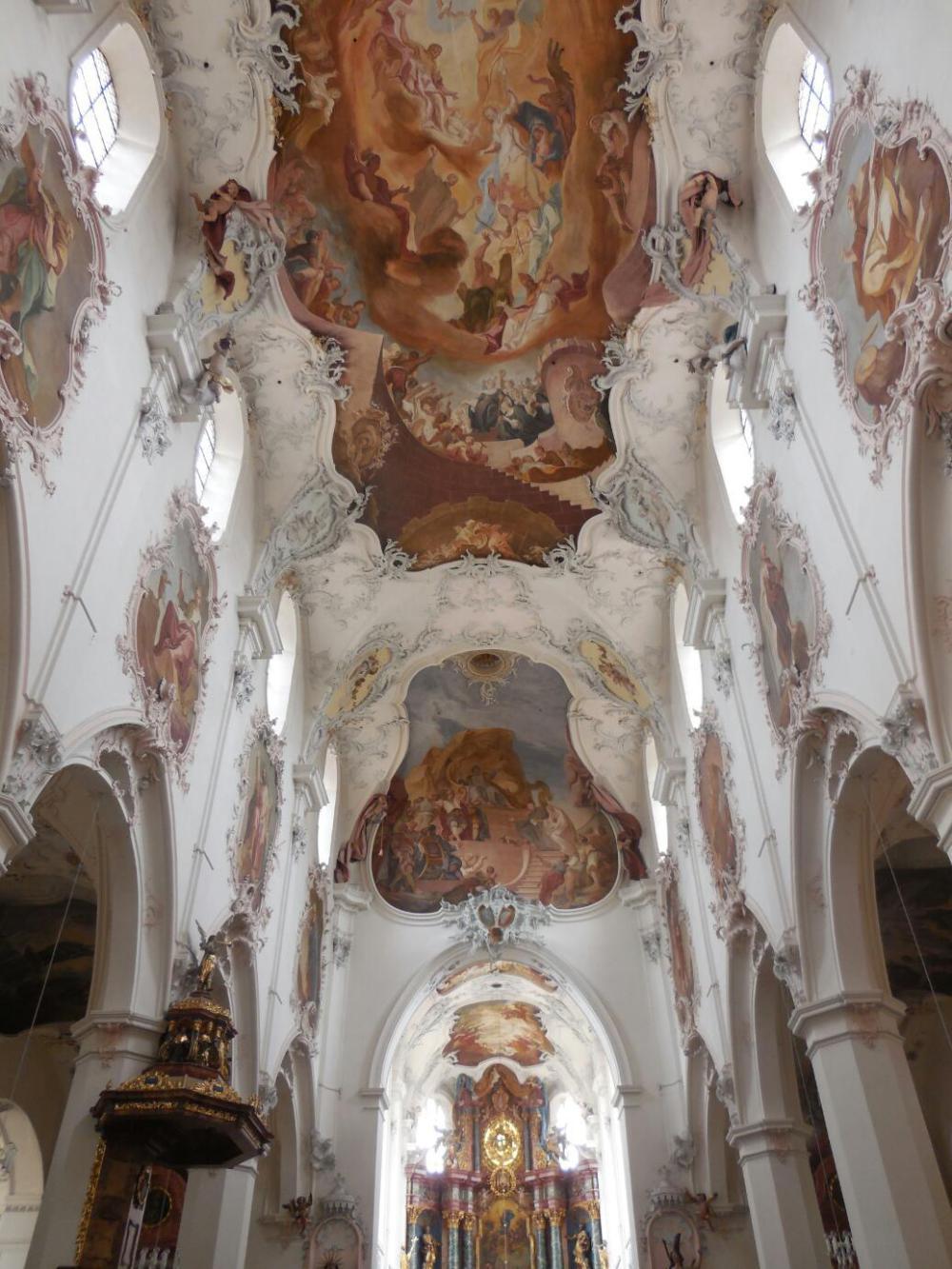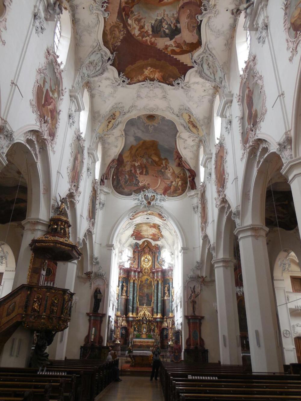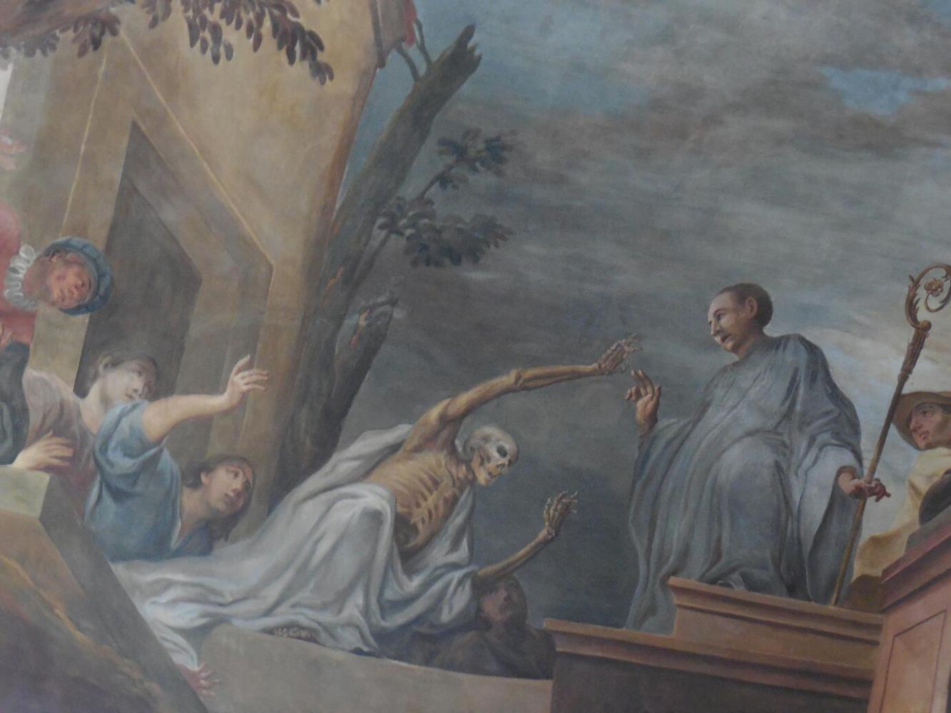 The church in the square was also something else again. This was a flat out over the top fresco affair with high ceilings and lots of gold and marble. This is the church of St. Fridolin, and contains a golden box that presumably holds some part of him. On the box is the image of a skeleton, and one of the frescoes also has a prominent skeleton. Some research will be needed to find out who this saint is and what his thing is with skeletons!
