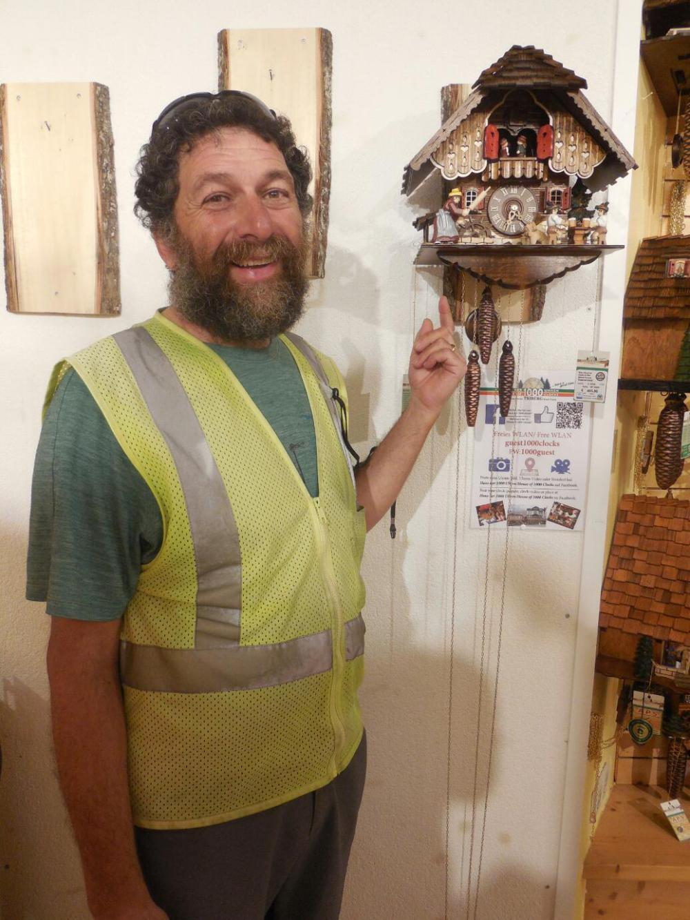 Inside, the museum seemed more about clocks in general, rather than being a repository of varied and historical cuckoo clocks. Actually, as we got in to it, we learned that the Black Forest itself is about more than cuckoo clocks, and the museum does trace the history of the Black Forest clock industry, cuckoos or otherwise. It turns out that the Black Forest was really the centre of a general clock industry. It may have started with all wooden clocks (including the gears), but though that is fitting for in the middlew of a forest, wooden clocks were not necessarily invented here. For a time, Black Forest was known for low cost, mass produced clocks. On particular variety, with a white lacquer face, was their best seller and most famous product. Itinerant pedlars would take these clocks around to sell, sometimes travelling far off in the world.