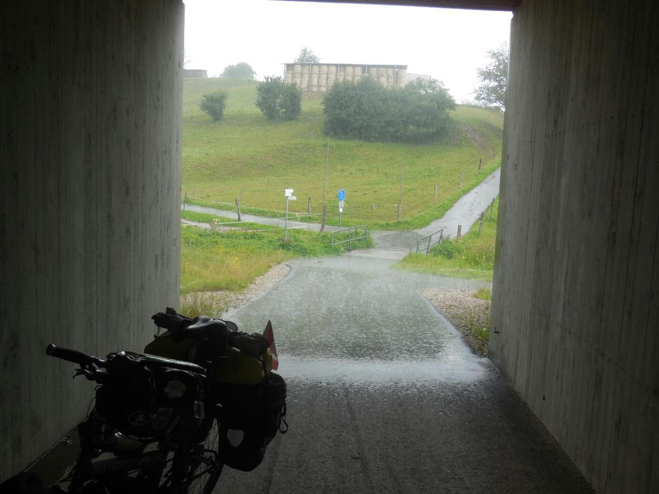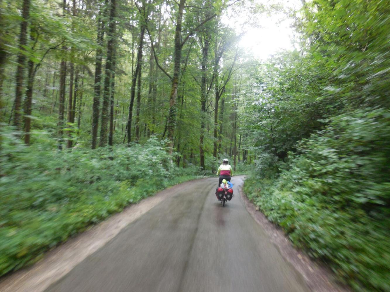 One thing that was approaching authentic Black Forest was the hilliness. This was not quite the land of switchback roads that we had seen yesterday, but it was hilly enough to have us pushing the bikes for lots of the time. This, together with the fact that it kept switching between warm sun and drenching downpour (causing us to repeatedly stop and change clothes) gave us one of the lowest km totals of the trip.