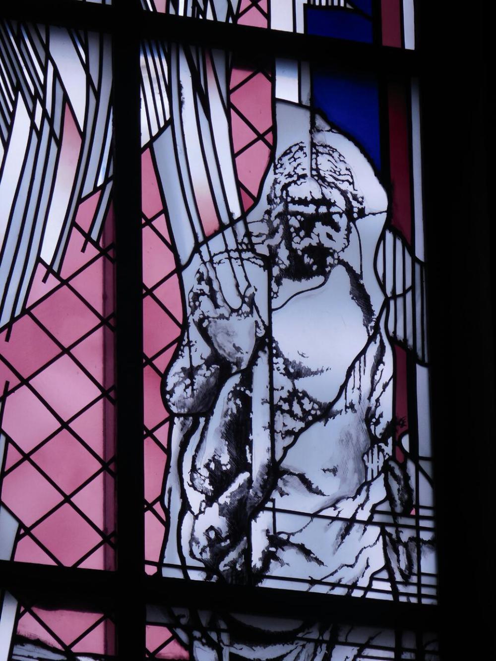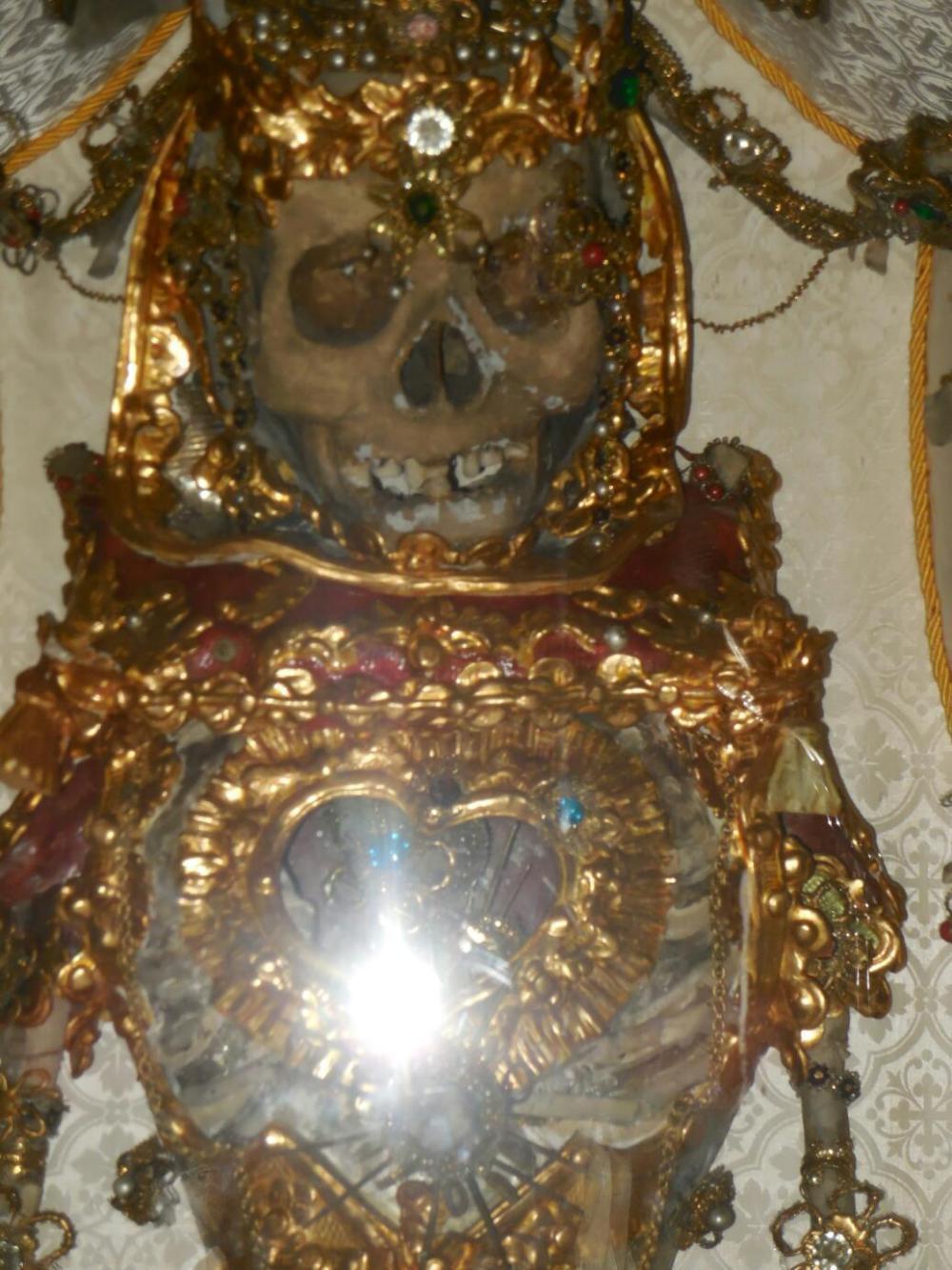 We went in, and yes, the three skulls and other bones had been used to make up the alter on one side. Dodie had a close look at this. It was very spooky. We think their hearts were in there too. Dodie moved a pot of flowers to have a closer look, and I warned her not to mess with these ladies. I looked up, and the image in the stained glass looked like some sort of angry simian. This was one spooky place. Sure enough,as we prepared to leave, a huge black cloud appeared over the church and just pelted down heavy rain. This forced us back inside. I went to look again at that stained glass - maybe I just had not focussed properly on the image. Nope, still spooky.