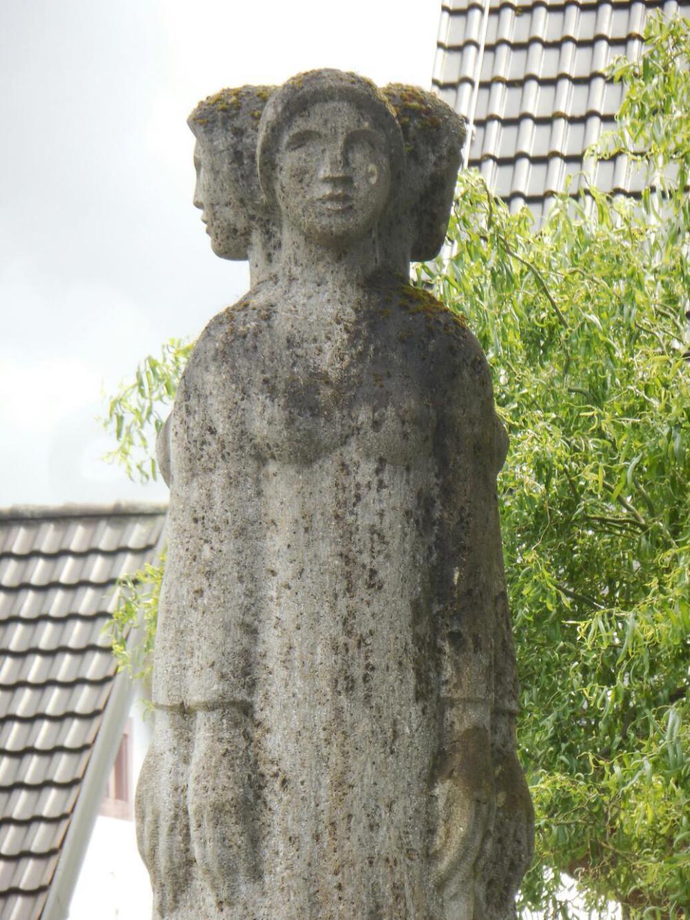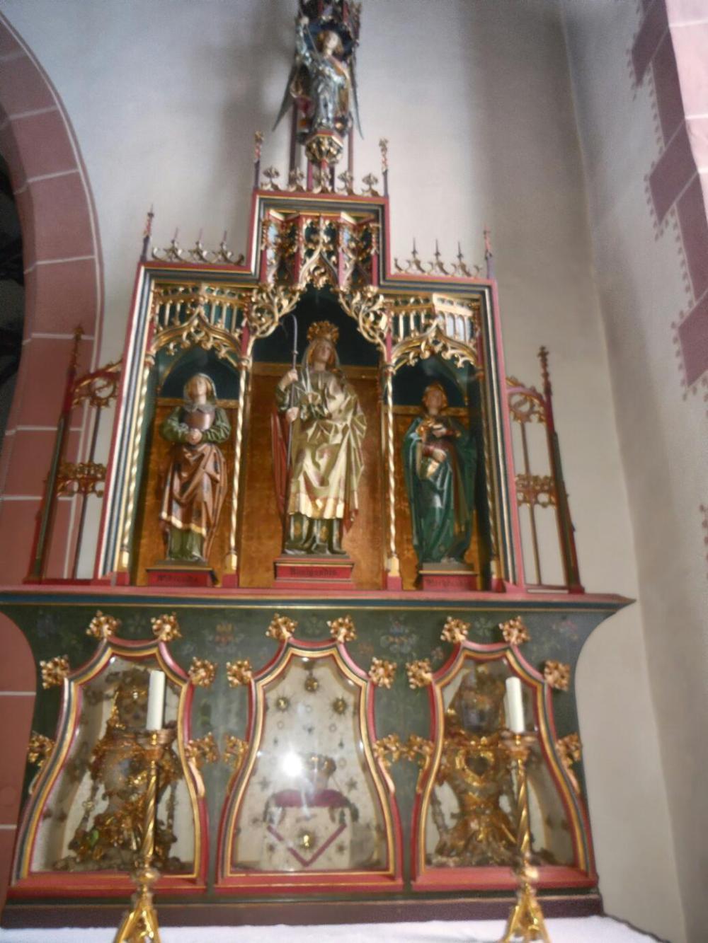 When we came to the church in the little hamlet of Eichsel, we expected a basic one. The first indication that this one had something special was a plaque nearby, in German and French, telling the story of the three virgins: Kunigundis, Mechtundis, and Wibrandis. These three were accompanying Ursula (the one who ended with her arm in a gold reliquary - some churches back) around 700 a.d., when they fell ill (in some way) and died. They were buried near the church of Eichsel. Subsequent miracles near the graves (the plaque did not say what) resulted in the three becoming saints. So they were apparently dug up and placed in reliquaries inside the church.