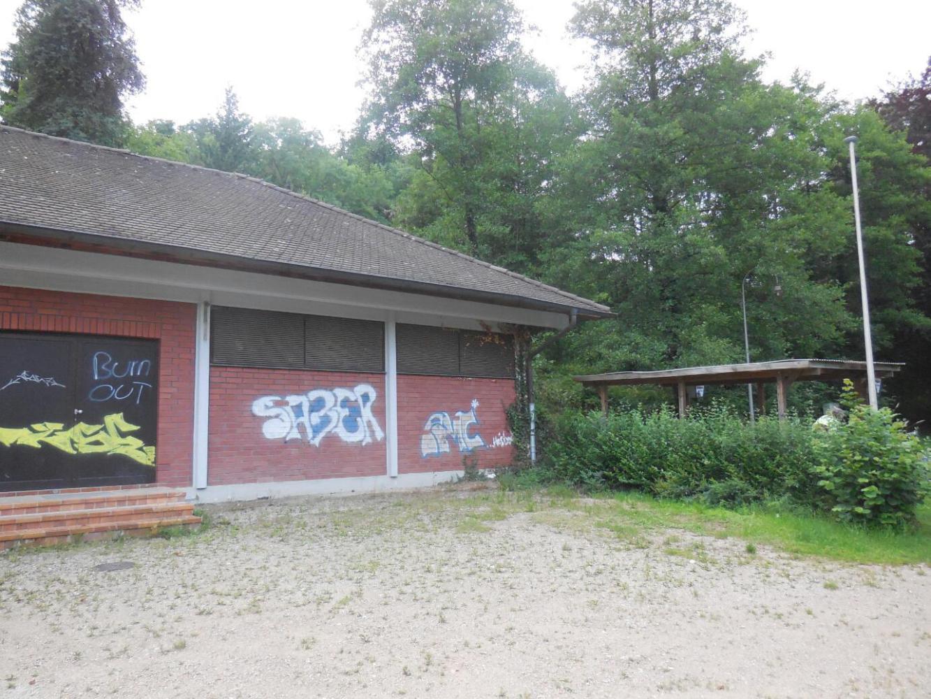 Back down the hill, by the swimming pool, we spotted a locked up and grafitti covered building, and beside it a little covered shelter. We went over there and decided it was a good place to prepare supper, and no doubt throw up our tent when it got darker. So we unpacked out food and stove, and were getting ready to cook something when the lady from up the hill appeared. We could not stay here, she said. No eating and drinking without paying! This remote site, she said, was part of the camping. We would have to leave, immediately!