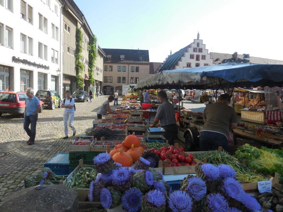 We cycled back in to Freiburg for a last look at the Munster and to check out any and all cuckoo clocks. As we had read in our guidebook, there was a market going on in the munster platz. This was not a farmer's market, but it had many stalls with good food. There were also high quality crafts, such as cutting boards, spoons, and other articles made from olive wood, and wooden toys.