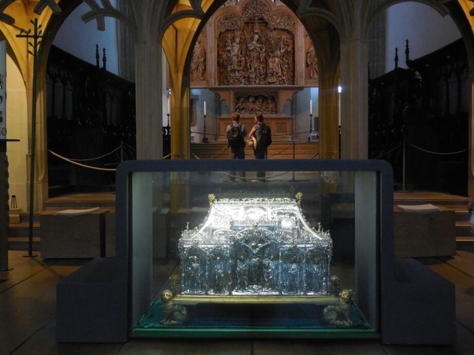 We pushed the bikes up the cobbles to the munsterberg. St Stephans is very plain, as munsters go, but it does have one good story. In 1162 Emperor Frederick Barbarosa conquered and sacked the town of Milan, Italy. His archchancellor was archbishop of Cologne, and he took the opportunity of ripping off Milan's greatest religious treasures, being the bones of the Magi, plus those of the two patron saints of the town: Gervasius and Protasius. He was shipping all this booty to Cologne, and stopped off at Breisach. The people here asked for the bones of one saint to be left, and he agreed. But then his ship (in some way) refused to leave the dock. They swapped saints, but the result was the same. So it was clear the saints could not be split up (they were twins), and both were installed here. At first they inhabited wooden boxes, but in 1496 they got a new silver one (which it seems they are sharing). The silver reliquary is the focal point of the St Stephan's munster.The Magi ended up in Cologne as planned.