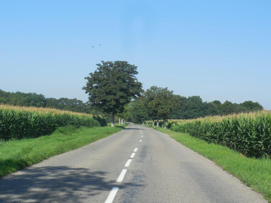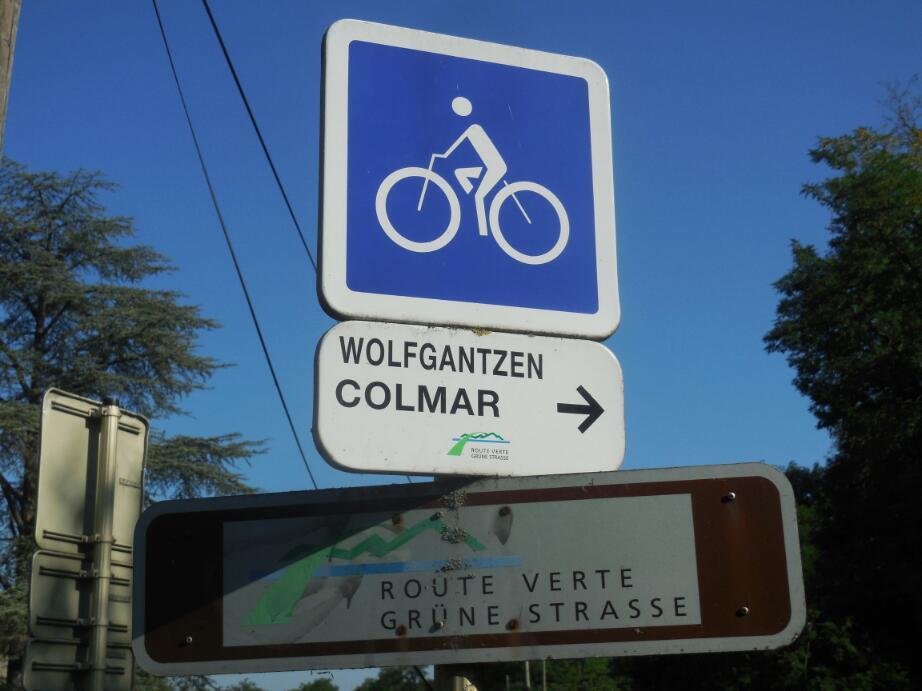 The next difference was the lack of those great green on white bicycle direction signs, found in Germany in addition to radweg markers. Instead, we were once again back on quiet country roads, following car direction signs to the next town. To be fair, the French did come up with some "Route Verte" bicycle signs for the way to Colmar, however this did not (always) mean that there was a separate bicycle way.