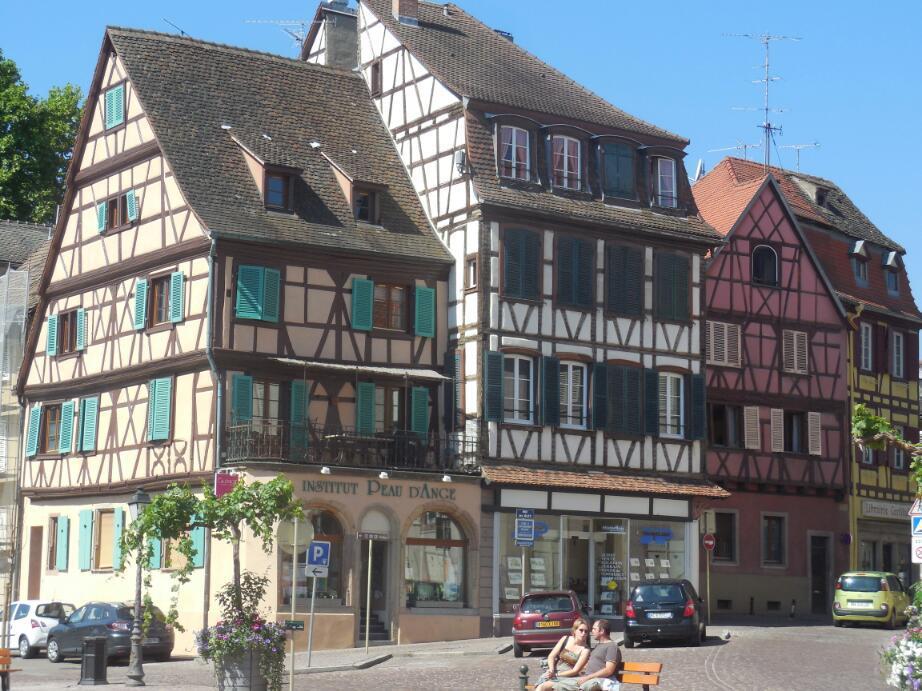 So Colmar presented us with a lot of fachwerk (half timbered) buildings, mixed with four story ones with nice window treatments, and other beautiful buildings - hard to say what style (how about - Alsatian?) We immediately realized that while we could just try pushing the bikes through it, that would not do it justice, nor would it be totally easy, with much to see and lots of people to dodge.