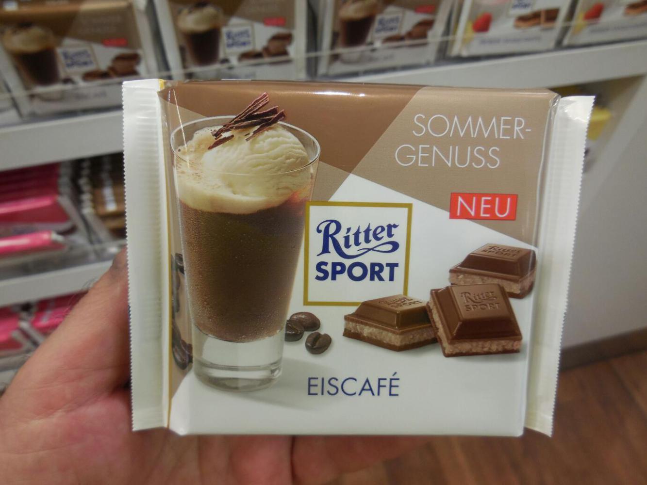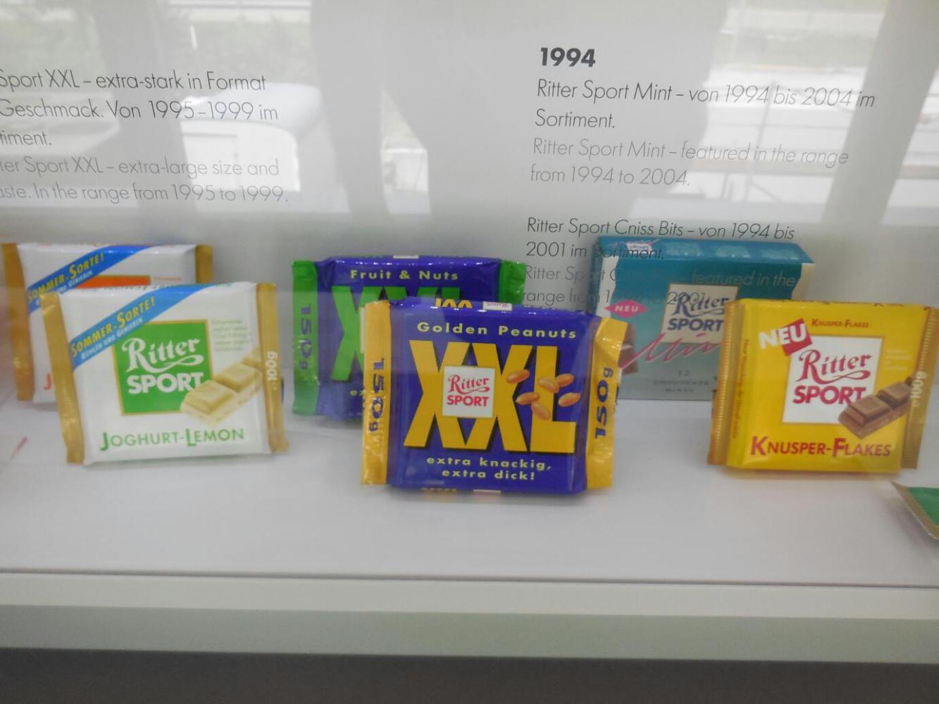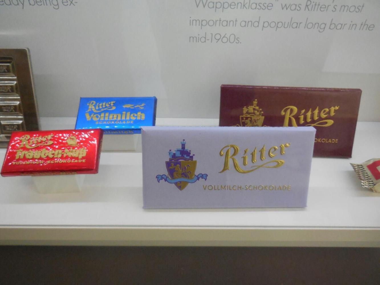 Ritter has set up a very nice building, that contains an extensive display on how chocolate is made and on the company history, plus a film (German only) on the same subject. Then there is the factory store, which is an education in itself. There on display is the full range of products, including "test" flavours. Not sure if these test ones are failures, coming soon, or just under consideration. Remarkably, the standard price for the standard 100g size is .69 euros. and seconds or bulk packs can bring the price down to .49! Regrettably we really could not buy much, because of the heat. What we did buy was in fact a gooey mess by evening.