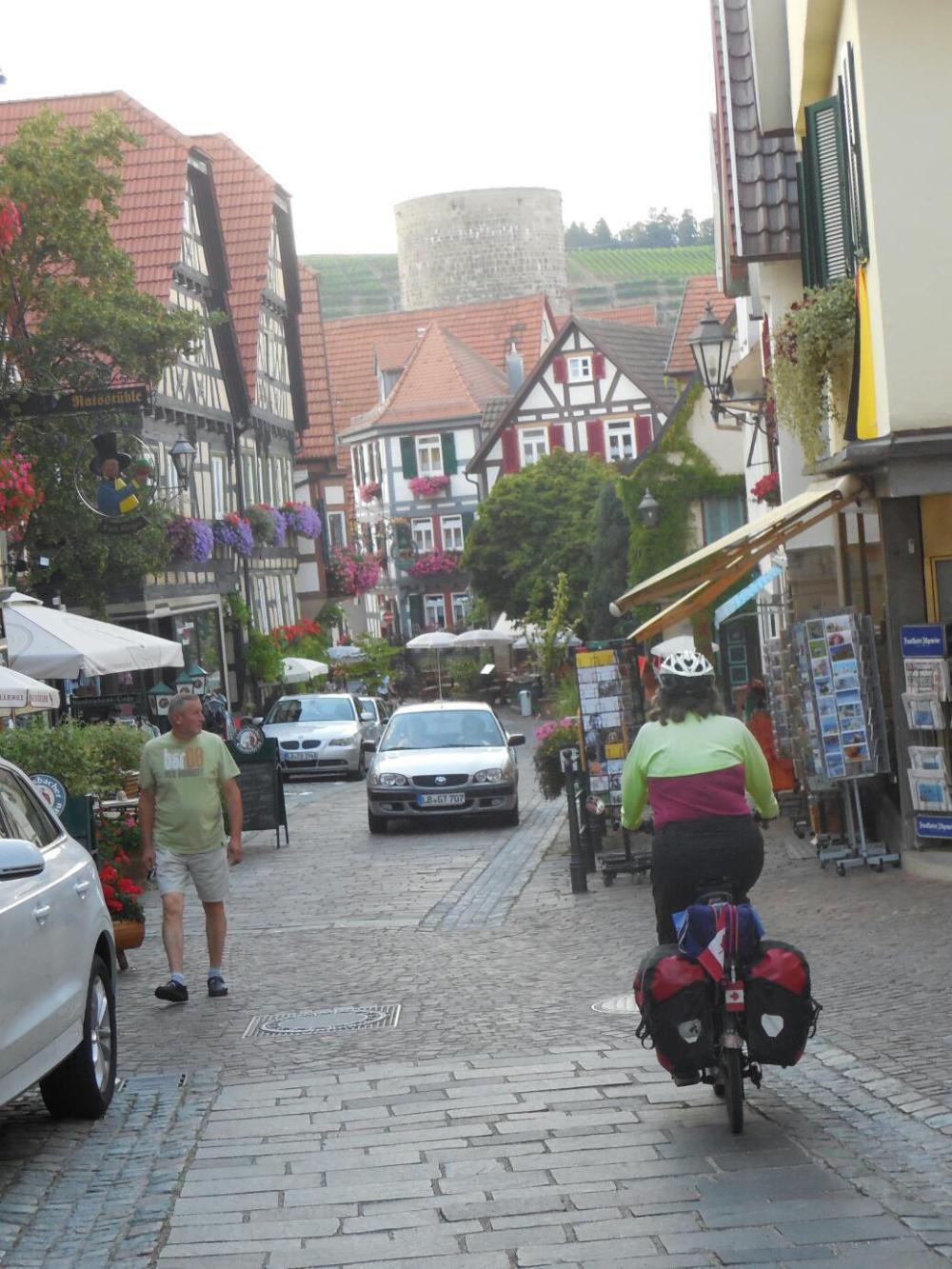 It was really not until we came to the spot where we planned to stop that we hit the flat out fachwerk beauty I had been expecting. So that is the town of Besigheim. Even with Besigheim, the approach roads had heavy traffic, and too many nerve jangling noisy motorbikes. People in cars, too, seemed to be blasting their radios. When we got into the altstadt, we found a really nice rathaus and surrounding buildings in the square, plus a beautiful cobbled street. Even here, though, they had made the mistake of allowing cars. Although there were not many of them, having them trundling down the cobbles, scattering people and cyclists, was disconcerting.