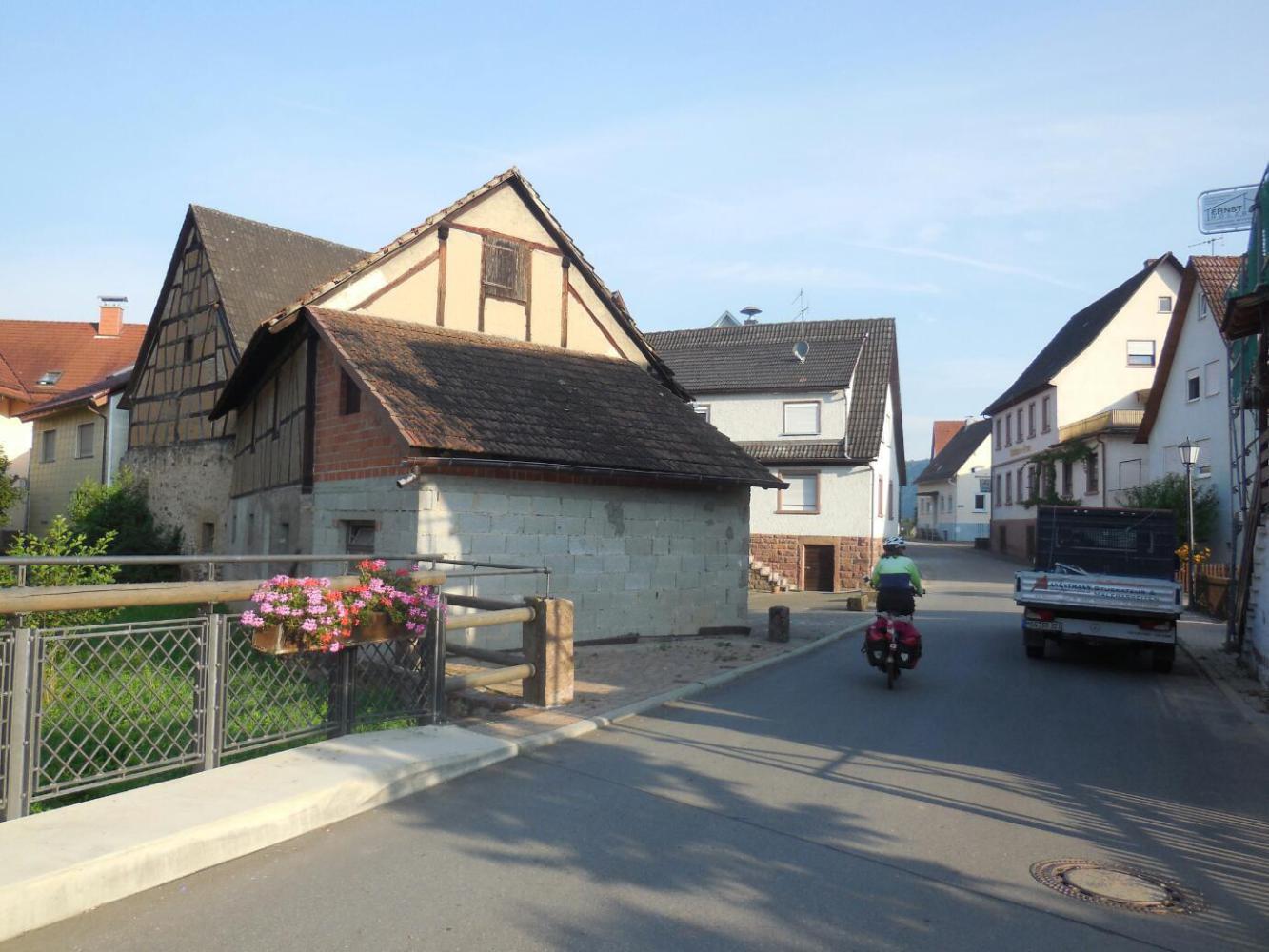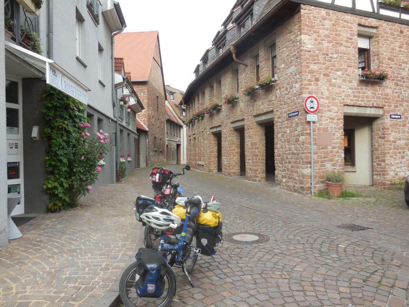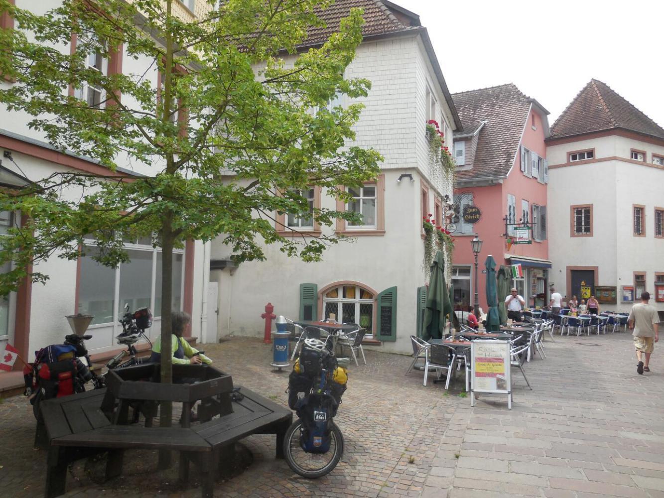 When last through here, we wrote of stumbling on the town of Ladenbrug. Here was a nice market square, with fachwerk houses, and just a few restaurants around. That time, we had eaten at one of them and then rushed the last 10 km to the camping at Mannheim. This time, we found the little hotel Cronberger Hof, and stuck. We proved too beat to go out and look at the town, though the town pamphlet lists 17 things to look at. This includes some Roman ruins, several churches, and a museum, residence, and first garage of Carl Benz, claimed here to be the inventor of the motor car. Tomorrow, we will respond to all this with a quick spin around the market square by bike - not very good tourists, really.