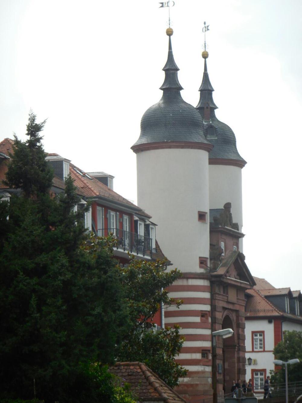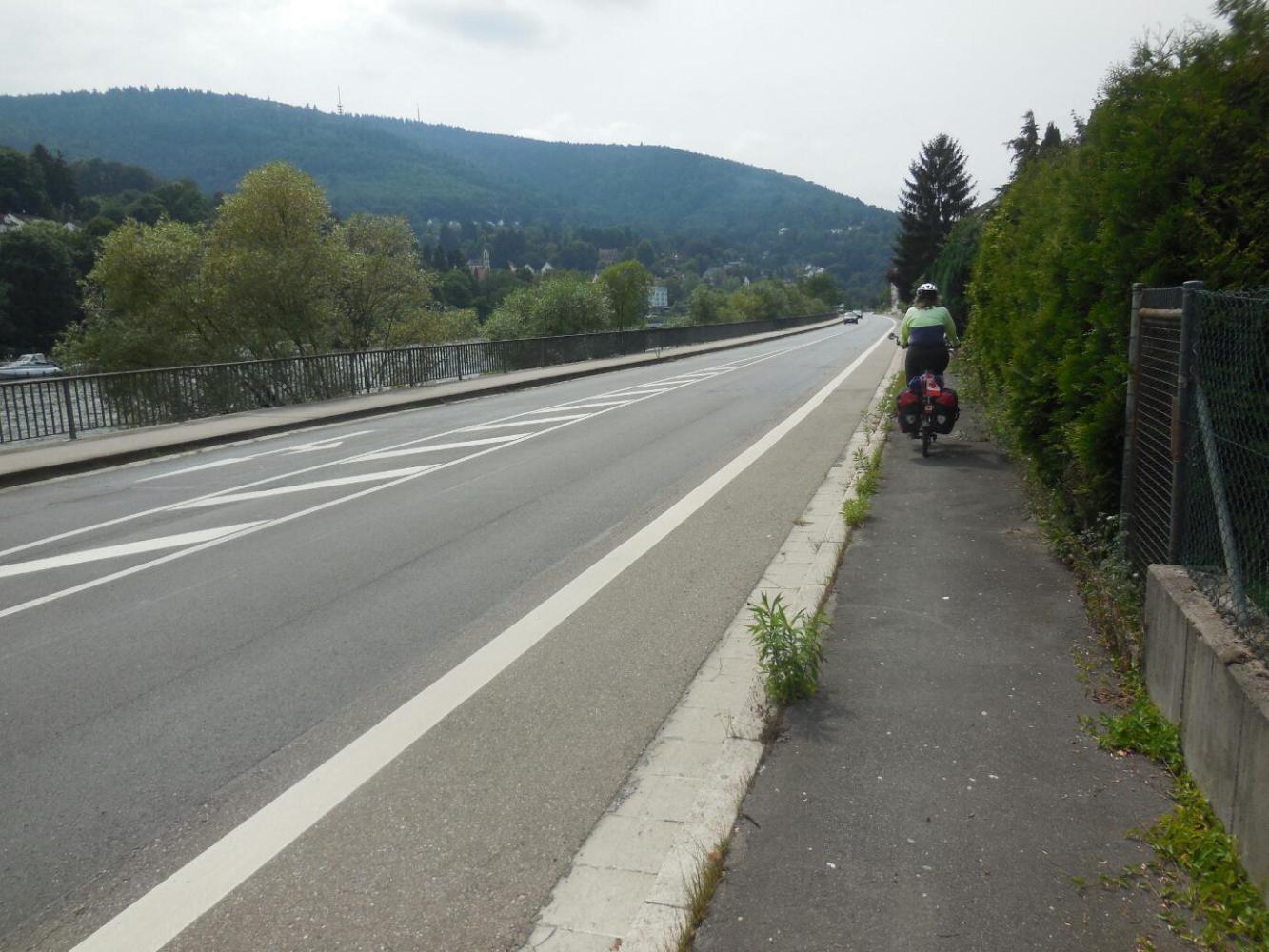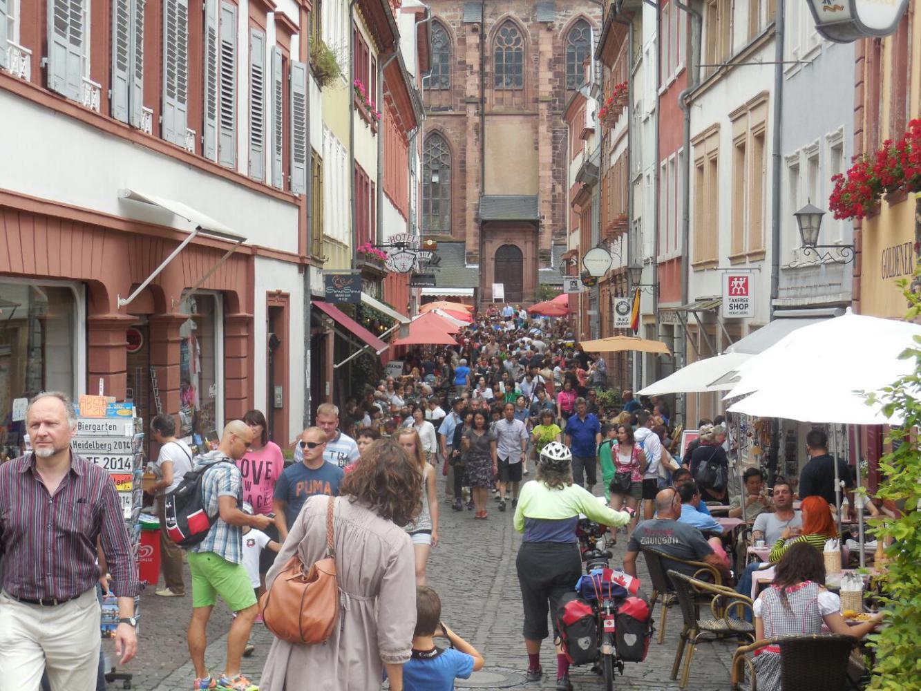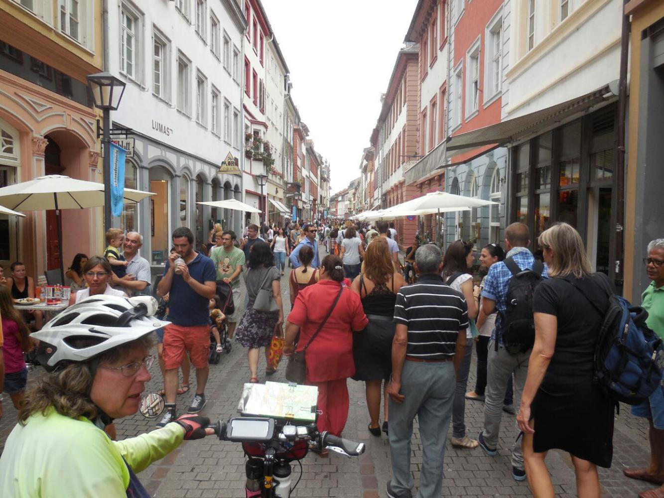 Now about the market square and high street. Approaching Heidelberg, as we did, from up river, there was little inkling of what was to come. I (with my poor map) actually did not know which side of the river to expect the town on. Both sides showed basically wooded hills. We passed a sign that said Heidelberg, and dutifully snapped its picture as a reference for any photos to follow, but there was nothing but trees. It took another 2 km for the town and the famous schloss to come in to view.