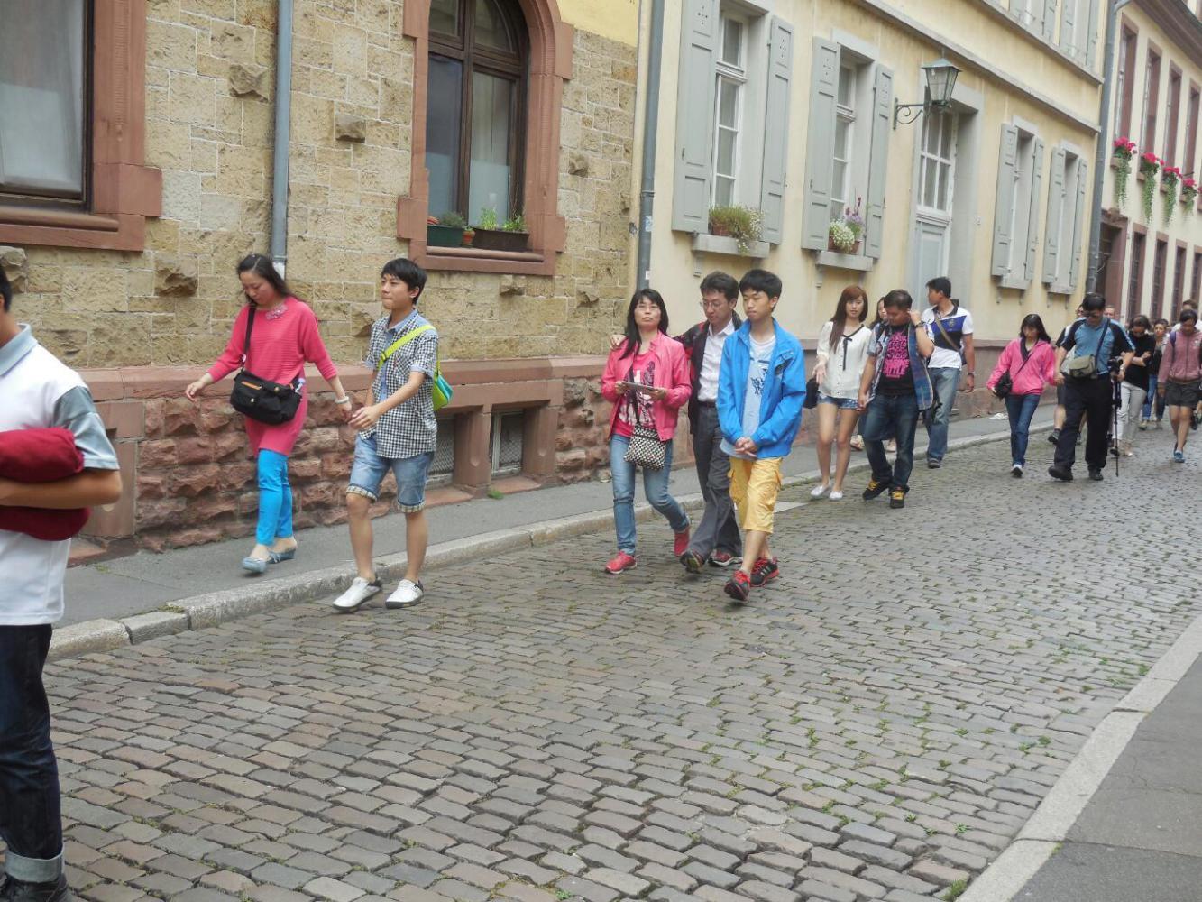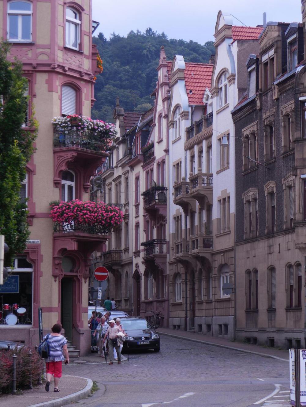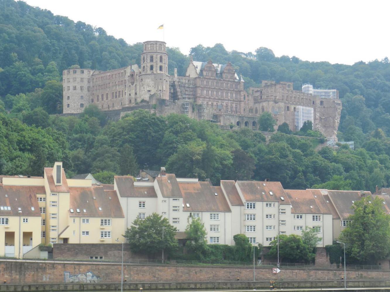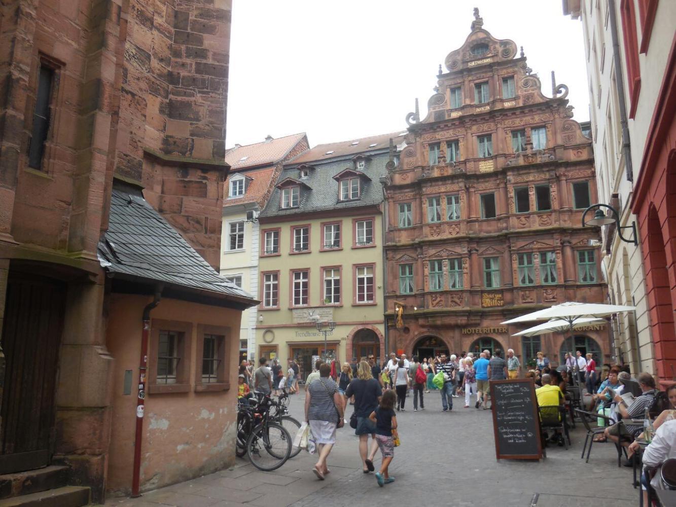Now about the market square and high street. Approaching Heidelberg, as we did, from up river, there was little inkling of what was to come. I (with my poor map) actually did not know which side of the river to expect the town on. Both sides showed basically wooded hills. We passed a sign that said Heidelberg, and dutifully snapped its picture as a reference for any photos to follow, but there was nothing but trees. It took another 2 km for the town and the famous schloss to come in to view.