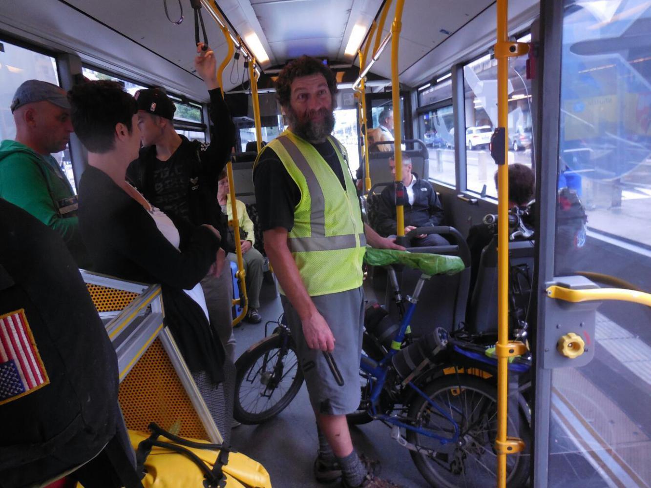The shuttle bus that serves the Ibis and the Mercure looks big, but actually is stuffed almost entirely with seats. Luggage goes in small compartments underneath. With forced cheeriness (to help the bus driver have a positive attitude), we lifted our bikes up the steep back steps of the bus and stashed them in a small space behind the last seats. Only 20 inch or smaller bikes could succeed with this! Including the stop at the Mercure, the bus filled, including the standing room, so we were glad we had been the first in line at the first stop.