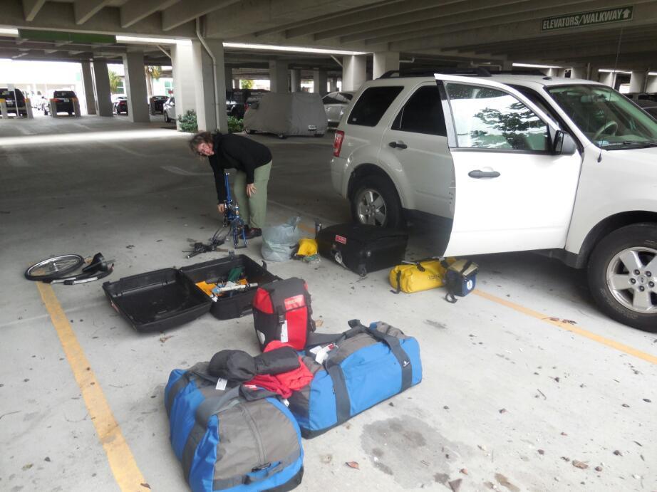 Hwy 1 is very heavily travelled and slow moving. So it meant we just dawdled down to Key West, and arrived with the light failing a bit. All day there had been a strong and cold north wind, and now it started to spit, Fortunately the airport has covered parking, and we paid to go in there, Fedex was also nearby, and so was the car return, So we quickly calculated the best order of operations, taking into account when things would close on us, and actually managed to return the car, pull the bikes from the cases, and ship the empty shells to Aunt Sophie in Tucson.