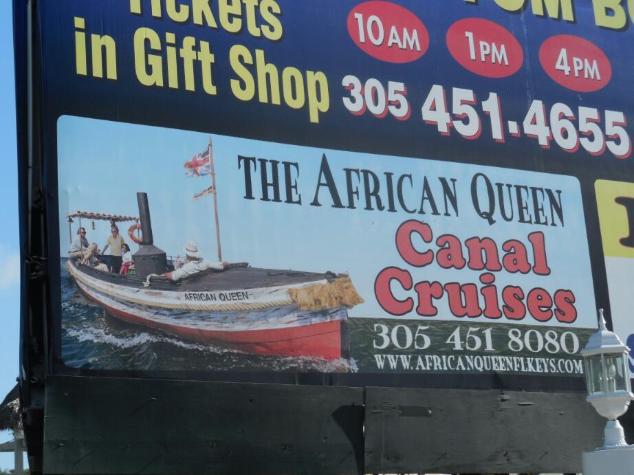 We had read that though there is no recognition of Humphrey Bogart and Lauren Bacall in Key Largo, the boat from the original African Queen is here. We thought we had found it, sadly shuttling tourists in its old age. But in fact there was just the sign, and no evidence of the Queen.