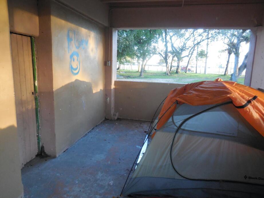 The Florida City municipal camping grounds are large, but very shabby. They seem to want $6 for the use of the broken down rickety shower facilities and $25 for a piece of grass. Since the office was closed, any willingness by us to cough up may be thwarted. We did pitch our tent in a garbage strewn "pavilion" near the play area. It has power, a roof, and lights, so actually this is suiting us just fine.