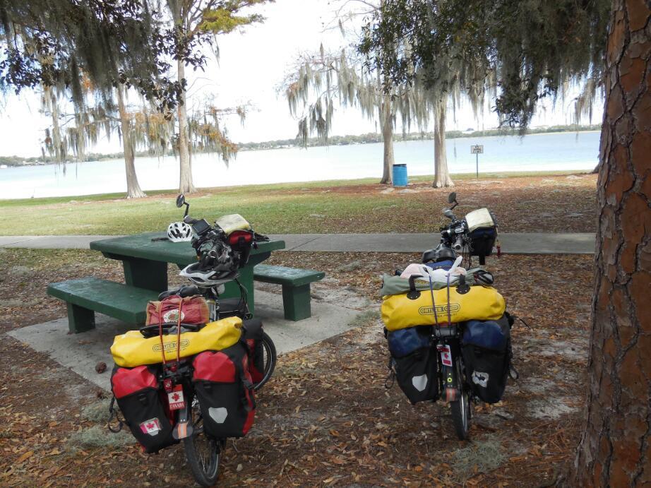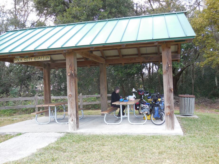 The Auburndale Trail ends at Polk City. We asked Google maps about camping, and it turned up an RV park with a phone number that was disconnected. so we searched motels. Hah, nothing. Not quite trusting the database, we asked a local parent at the playground near the end of the trail. He laughed at the idea of something so advanced as a motel in Polk City, but he did proudly point out that it had one restaurant,