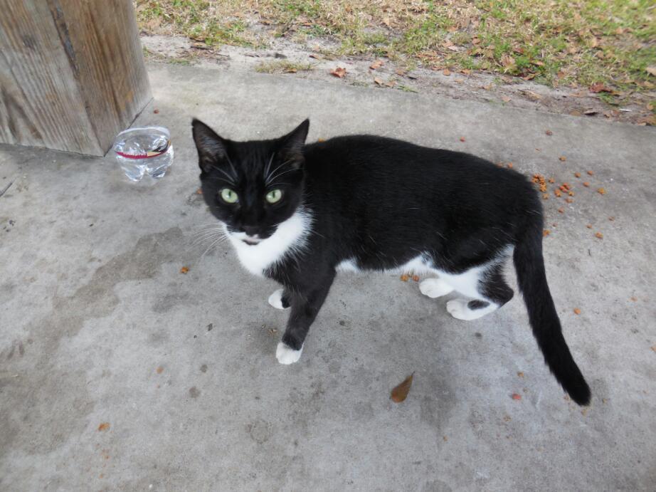 Here at the trail head is a covered shelter with excellent tables. Two cats live here, with somebody obviously feeding them. It's really homey to have a roof, table, and cats. Dodie is spoiling them by sharing our tuna. Now they expect more and she is having to explain that that's all we had. Like all cats, they do not appear to speak English. Oh, oh, they just invited a third cat friend over to our party....