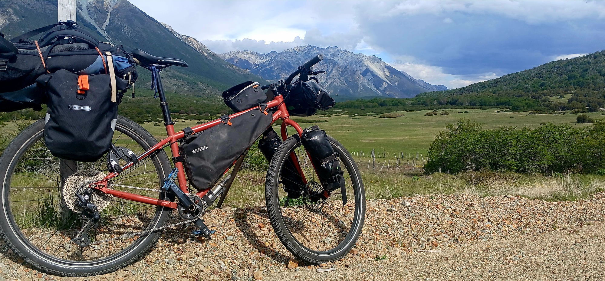 Once over the hill I roll gradually downhill into a roundabout where I join the main Route 40 south and continue upon a wide gravel shoulder as there is a steady flow of cars and trucks on a narrow road. In any case, the big wide 29er tyres revell upon crunchy gravel. This shoulder continues well beyond the limits of town, though eventually narrows and in parts is reduced to a single track. Nevertheless, its nice riding on mountain bike tyres. A few road bikers fly pass on the tarmac and give a wave.