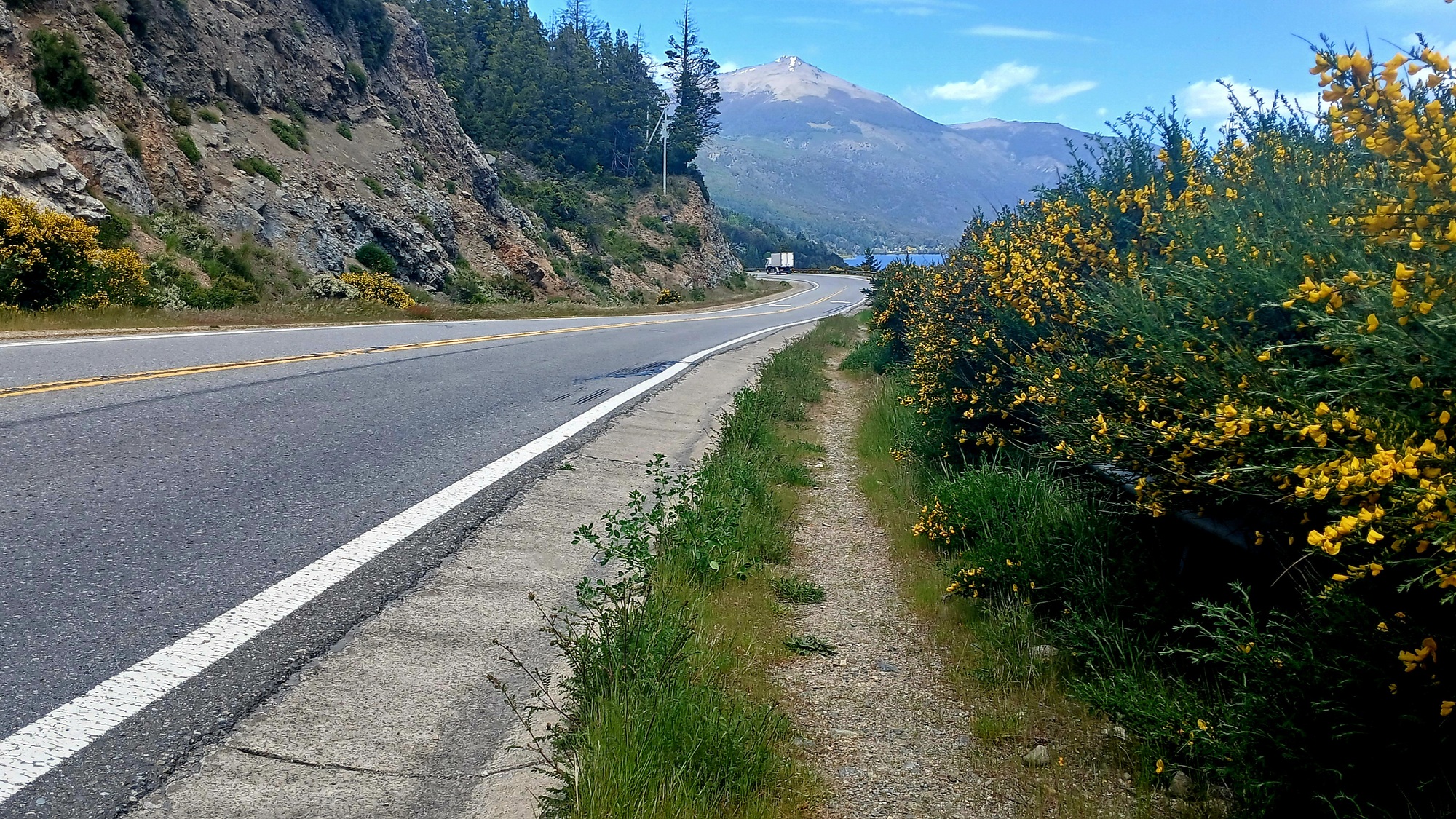 Whatever way you leave Bariloche heading south, its a steep climb. The way I stumbled upon having ridden away from the hostel-street to go left at a tee-junction was a steep wall at about 20 percent gradient. And with so much weight on the back after a food-shop, the bike was back-heavy; it was all I could do not to stop and get off and push. I rode on the gravelly walkway at the side as there was a steady stream of vehicles.