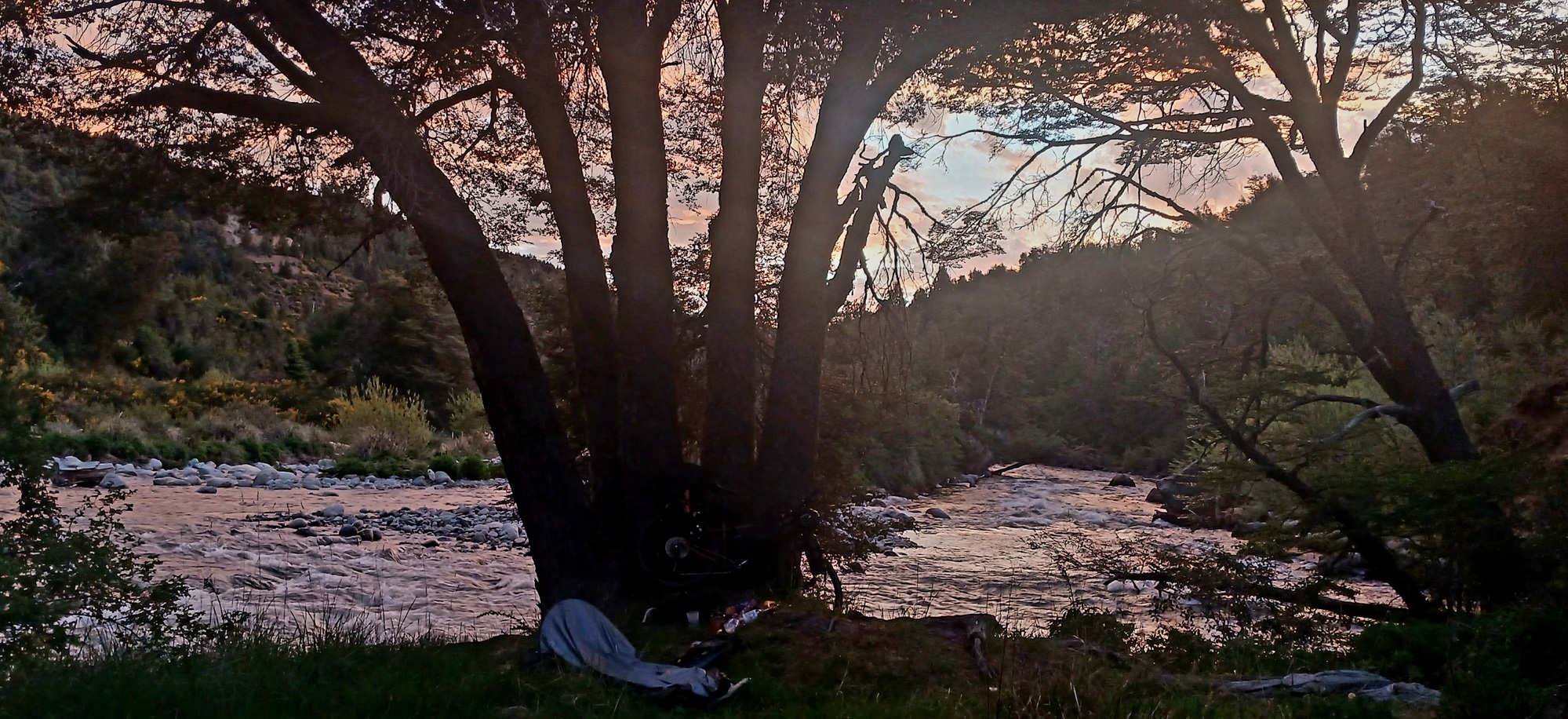 It wasn't steep, it was the type of climb with an uphill section followed by a level, followed by another uphill. I had planned on reaching Rio Foyel where I knew I could camp, but I thought it was not that far. Then I reach the small vilkage of La Foyel with the El Viejo Amacar (old shop) advertised on billboards a good way back at kilometre 1960. By now it was spitting rain. An oily fragrance of fresh rain on tarmac filled the air as the road went up again onward from La Foyel. I had hoped of having camp set up early but now it was getting on toward 19 hrs. Anyway, at last the road dropped sharply into a valley to cross a long bridge over Rio Foyel and I go left down a horse trail to the riverbank where I set up my bivuac and cook pasta for supper.