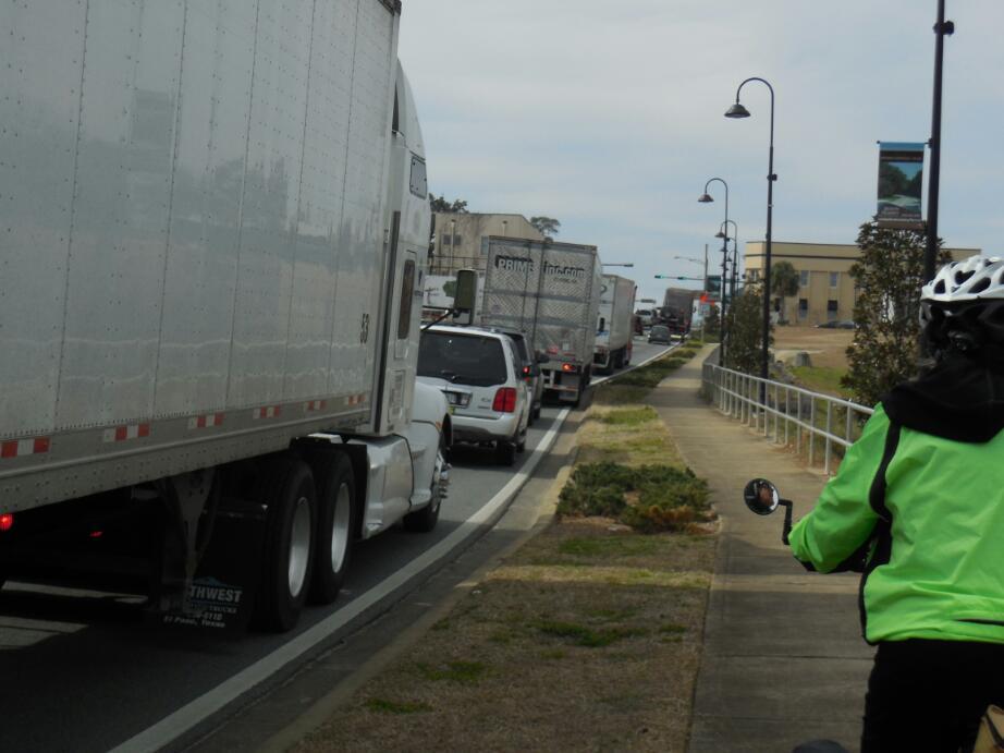 We bundled up in all our layers, including three hoods, and set off down the highway. As often happens, reality was not nearly as bad as what was feared, and in fact it turned into very pleasant cycling.The exception was the traffic diverted from I-10, which was way worse than feared.