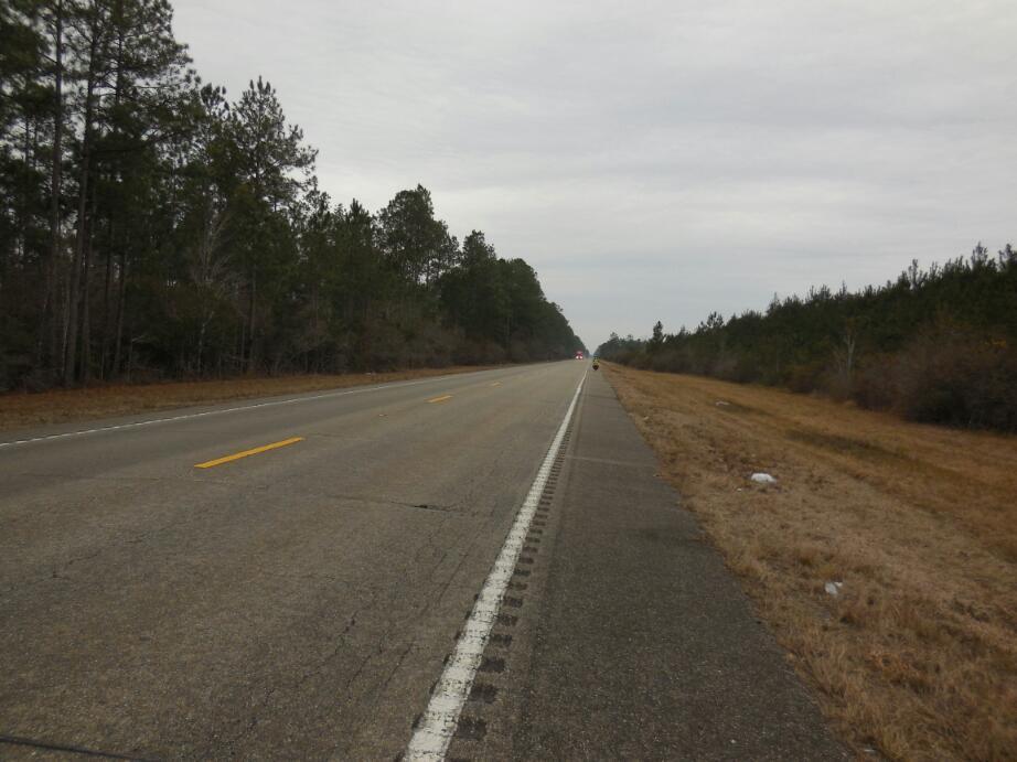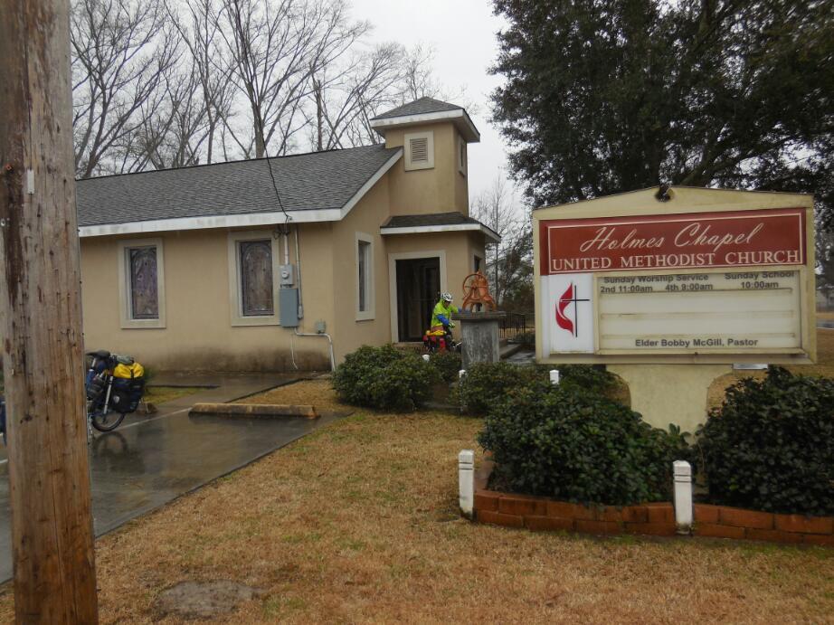 Using our newly learned "trick", we looked to a nearby church. It had a tiny entry vestibule that was unlocked, but otherwise was locked and unoccupied. We piled into the vestibule, leaving the bikes in the rain. We put down our stools (thanks, Trish) and ate our sandwiches in the relative warm. Now at this spot there was no cell service, at lest that the T-Mobile SIM could find, so we were blind as far as locating motels went. We did however know of a campground and cabins in Slidell. We called them using the ATT phone, and they said they were frozen out and were closed.