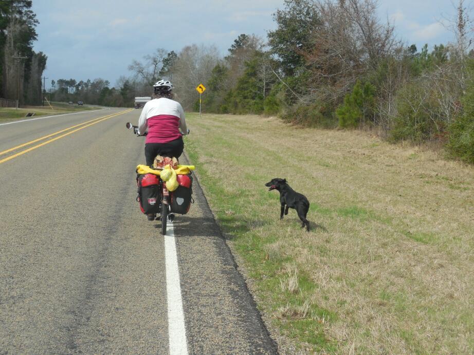 Something else happened in the dog category today. (Who would have thought DOG would rank so high among all the topics that can come up in a touring blog). While we were going along, just daring some dog to attack us, a young and friendly black lab silently popped up and began running with us. Oh no, not again. Go away, doggie!