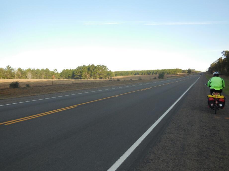 Now lacking in any chemical defence, Dodie stopped at the next Dollar General and picked up a bottle of wasp spray. This has a greater range than the pepper, and was recommended by some in the Guestbook, and some locals. It also fit in a water bottle holder. As it happened, and also as predicted in the Guestbook, this point in Texas marked the last of the aggressive loose dogs. One or two did come to the edge of their properties, but none took to the road, much less attacked. This change in dog keeping by the locals, plus having what we think is a very strong defence, has made a world of difference in our peace of mind.