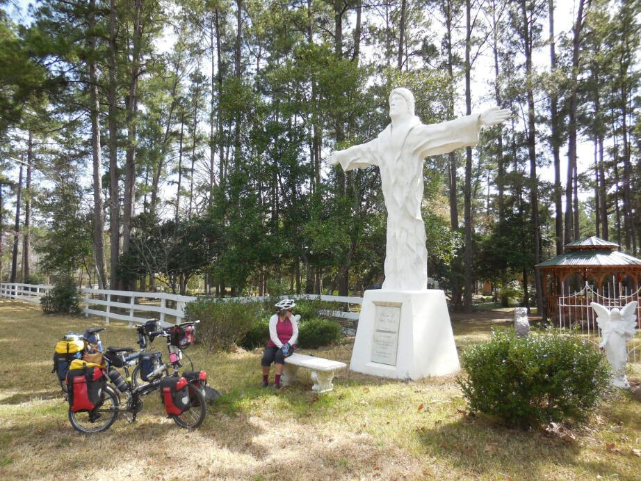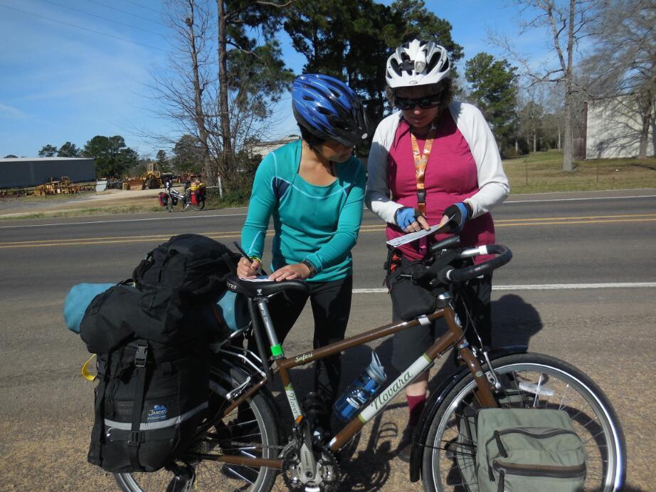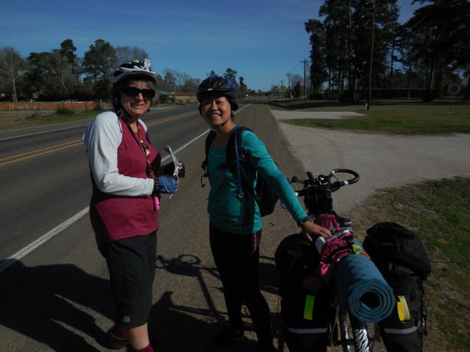 Out of Coldspring we had the pleasure of meeting Helen, a cyclist from Santa Cruz, California. She had not actually cycled all the way, but we don't recall her exact starting point. Helen, being young, was going along without maps - declaring ACA too expensive. Rather she was using her phone and Google. Naturally we gave her a review of what was coming up as she headed east, and she did the same for what we would meet immediately west. We were able to give Helen one or two maps that will be helpful. Also, though it had become clear that you had to be very close to use the pepper spray, Dodie parted with her beloved pink weapon and quick draw, Texas souvenir, lanyard. After some big hugs, we wished each other well and were off.