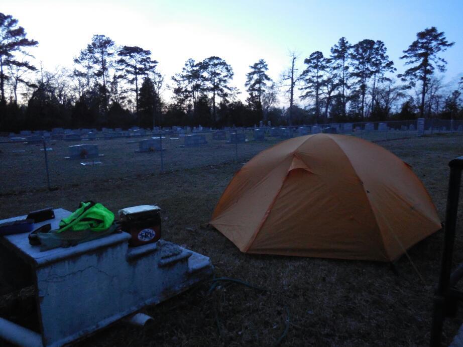 Lots of shallow hills slowed us down a lot. So when, 10 km before Richards, we came across a cemetary, we tucked inand pitched the tent behind the chapel. Now with 30 km to go to Anderson, and given that we had been averaging, including stops, not much over 7 kph, we knew we needed four hours in the morning before 8 am to pick up our map. We thought about getting up later and sending me (Steve) racing ahead but I am really loathe to split up. So we set the alarm for 4 a.m. and turned in!