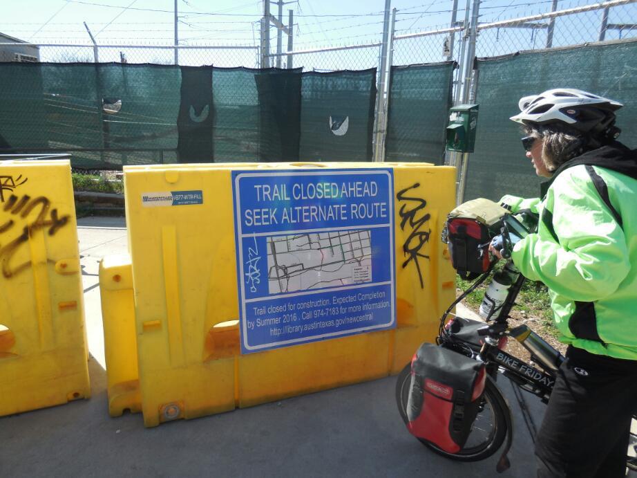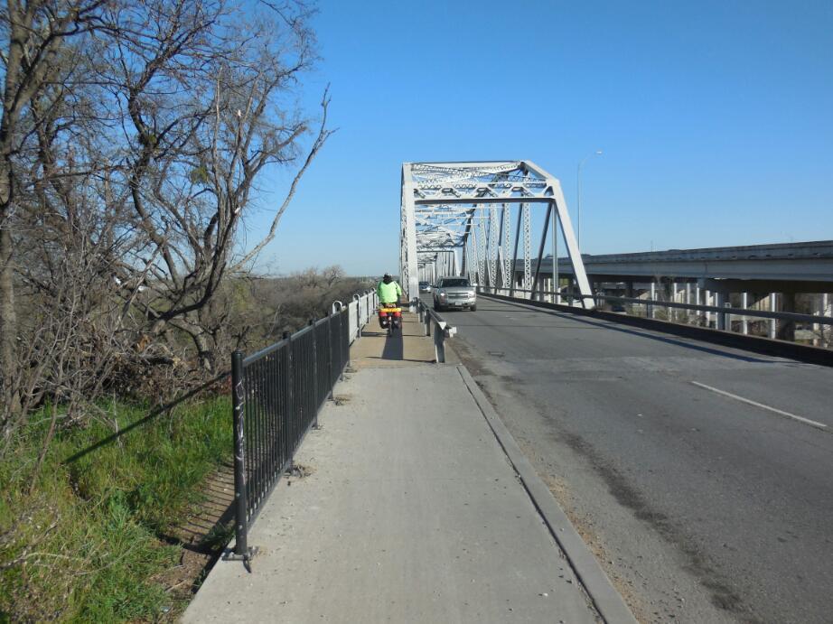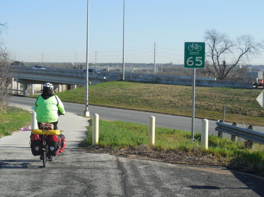 We set off from the motel along Montopolis Drive, the first bit of the new safer ACA traverse of Austin. ACA can not control the bicycle unfriendly design of most parts of American cities, only search for the best ways through it. In this case, Montopolis offered no room for bicycles, sending us scurrying to the sidewalk.