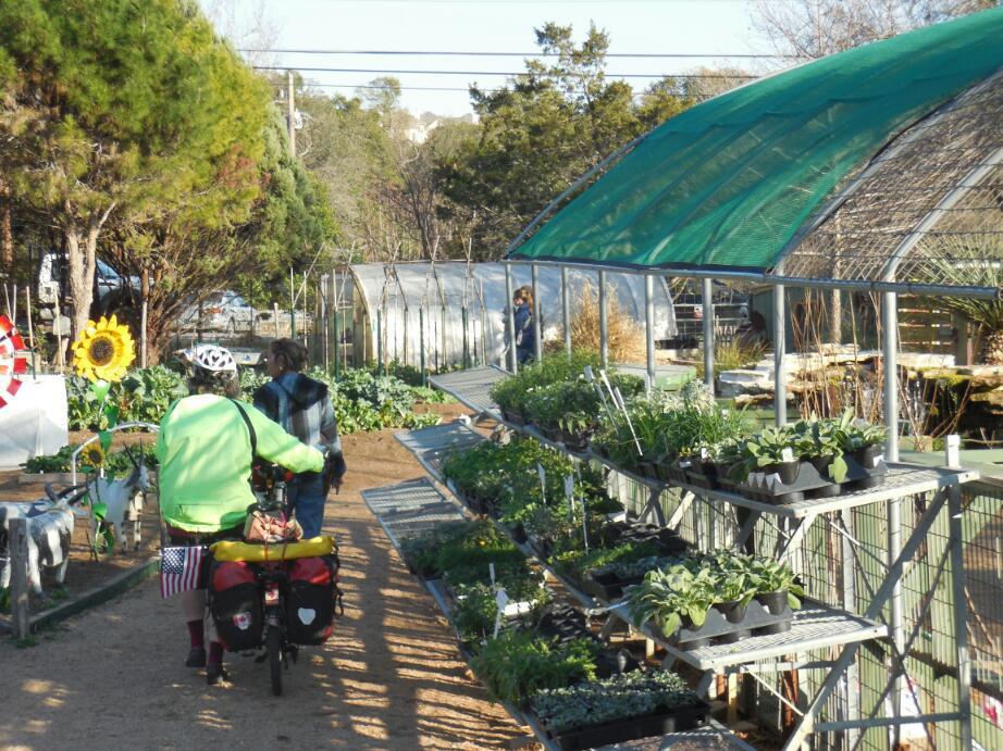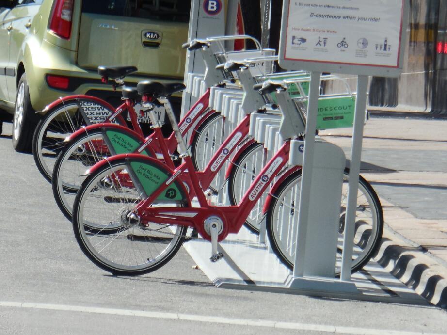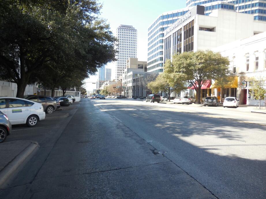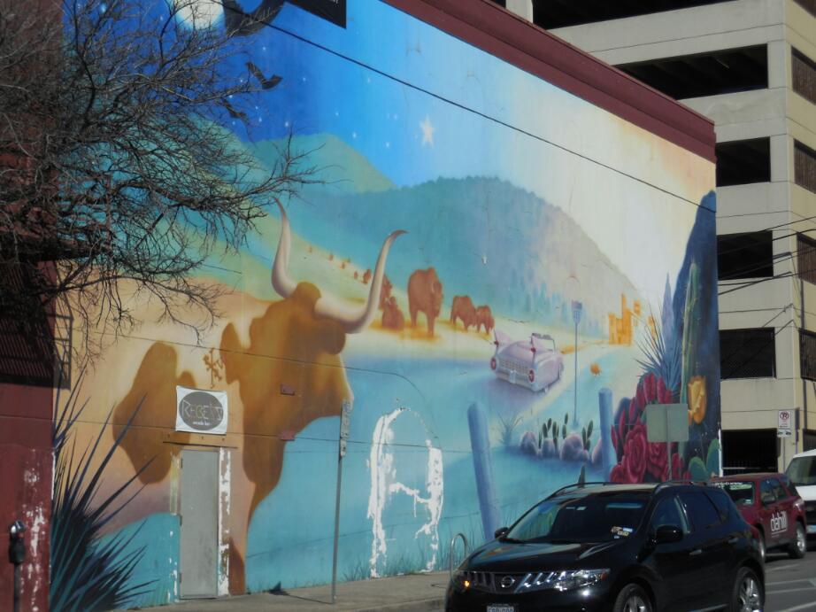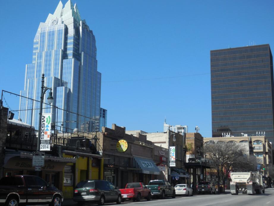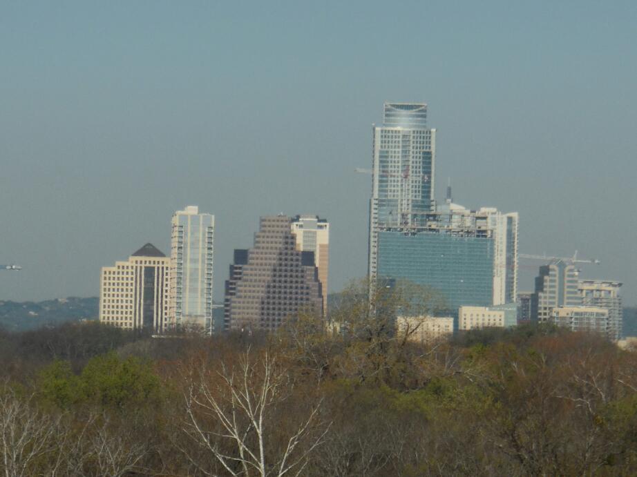 We did find the way, though, and also got our first look at the quite stunning Austin skyline. We travelled through some rather run down areas then, with that skyline leading us on straight ahead. Here we passed an restaurant, rundown looking, offering African food. As we passed, a black man in a black limo sort of vehicle addressed us. He was wearing just that type of fancy felt hat and clothes that fit my image of a drug dealer. But he turned out to be the owner of the restaurant. He said we should come try it this evening. Of course, we had to decline.What struck me most was just how sweet and personable this fellow was. Even if maybe he did also deal drugs, we liked him! As we parted he thanked us for stopping. I guess he realized it might have been a bit disconcerting to be flagged down from a passing black limo-like thing.