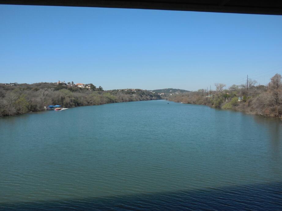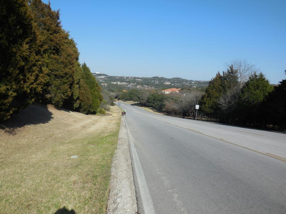 Presumably we were now starting with the Hill Country type environment because the roads went up and down and up and down. There must have been some extra up in there, because we eventually found ourselves atop a ridge with a sweeping view. From the ridge we plunged down, down, to Barton Creek, and then up up and out again. This is all suburban territory for Austin, and we passed many swanky gated housing enclaves, with stone construction and gardeners with trimmers swarming around.