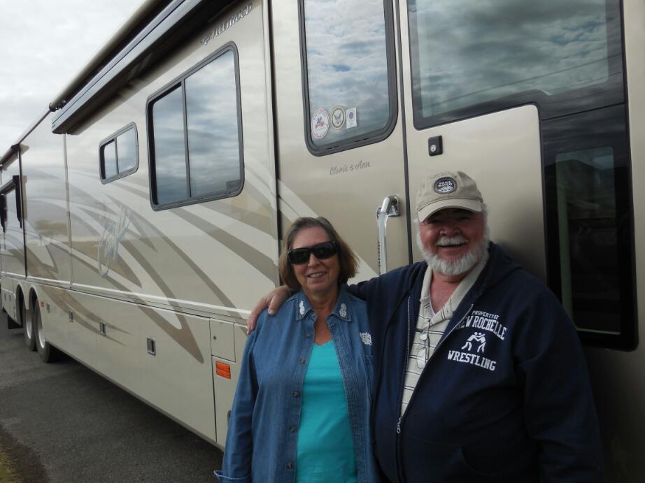 While we were sitting, just starting to write this and get some food going, one of those city bus sized RVs, towing an SUV, pulled in. The driver came over to have a chat with us. Just as we had the other day learned more about big truck driving, now we got to understand something about this giant RV phenomenon. The occupants were Clovis and Ann Gentihomme, originally from New Hampshire. They had been on the road four years, and were in the process of finally selling their home up north. About 70 years old, this was how they were choosing to spend their retirement. Clovis was full of information about places they had been and activities they do other than sticking in the bus. So although the giant RV might seem at first rather decadent, it was actually minimalist, relative to living in a giant house (like we usually do). These folks were very friendly and interested in our rides. Together with truck drivers, motor cyclists, and bicycle tourists, they are part of a community of people "on the road". (Note, I excluded ordinary RV drivers and other motorists - to be a club you have be exclusive somehow!).