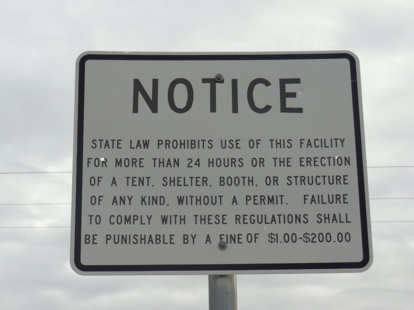 We arrived to find our spot waiting just where we figured it would be. This time, though, there was a sign whose wording would allow an RV or truck to stay for 24 hours, but prohibited tents. Again we say "What is wrong with these people!" We also of course said phooey on your sign!