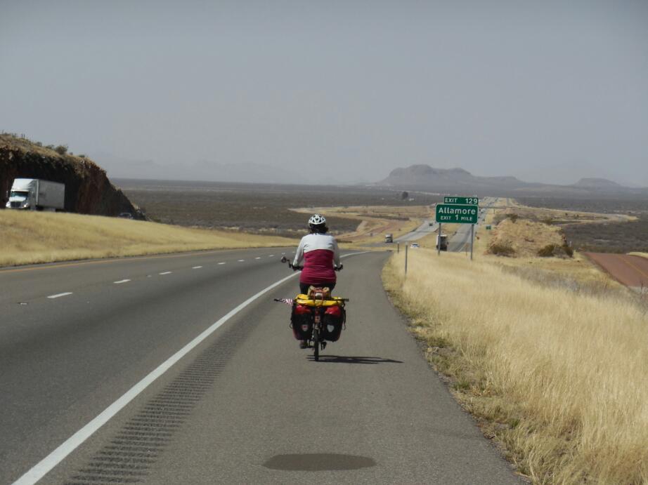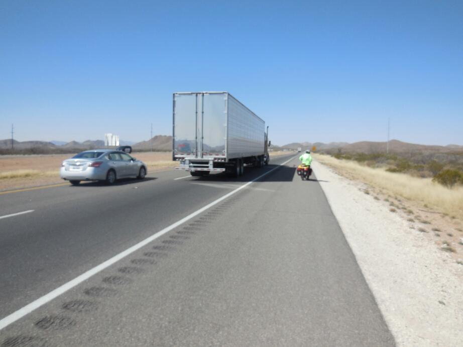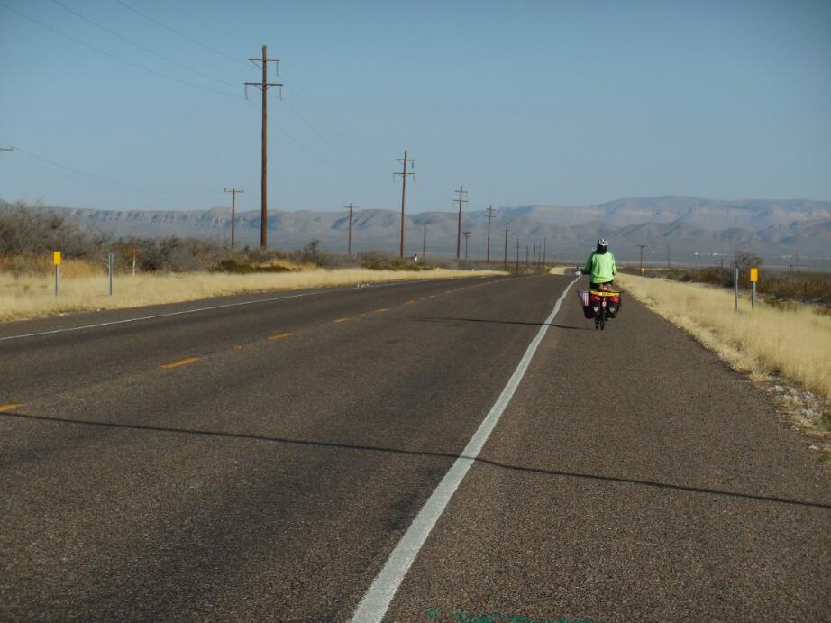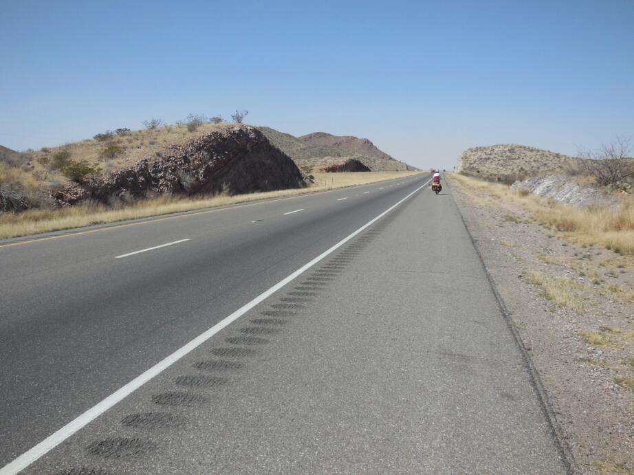 The wind, while not quite the strong tailwind we had hoped for, was a bit of a help, and we cruised along easily. In fact, the wide shoulder and very quiet road was wonderful, and a contrast to what we knew was coming when we would hit the Interstate at Van Horn.