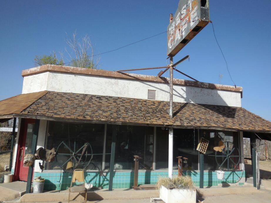 We continued down the "business loop", finding everything decrepit and closed. Except for a curio shop, decrepit but not closed. We ventured inside, and an old woman assured us that the nearest open motel was 30 miles in either direction.Dodie took a moment to rant about those dogs, and the woman agreed. "There are more dogs than people in this town", she said, "Everyone seems to dump dogs here".