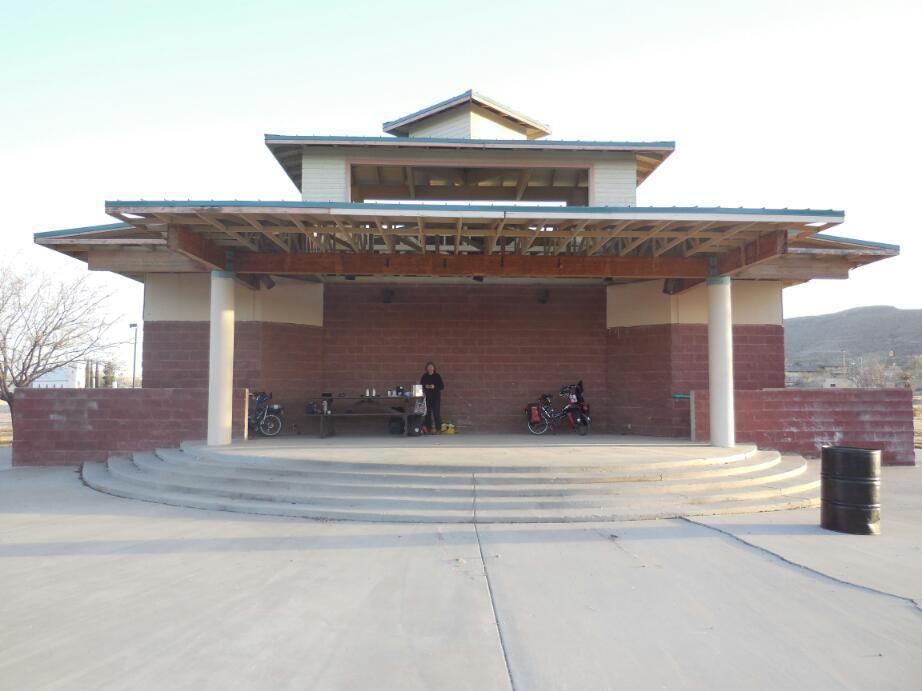 So we headed for the city park, which was mentioned on the ACA map. This involved leaving the precinct of the I-10 itself and of the I-10 business loop. We found the courthouse, the school, and the park. Objectively the park was a great find. It had a bandshell building with large covered area, picnic tables, power, and washrooms! Still, Dodie was freaked. "This town is a podunk shithole", she said " and I don't want to be anywhere near here!".