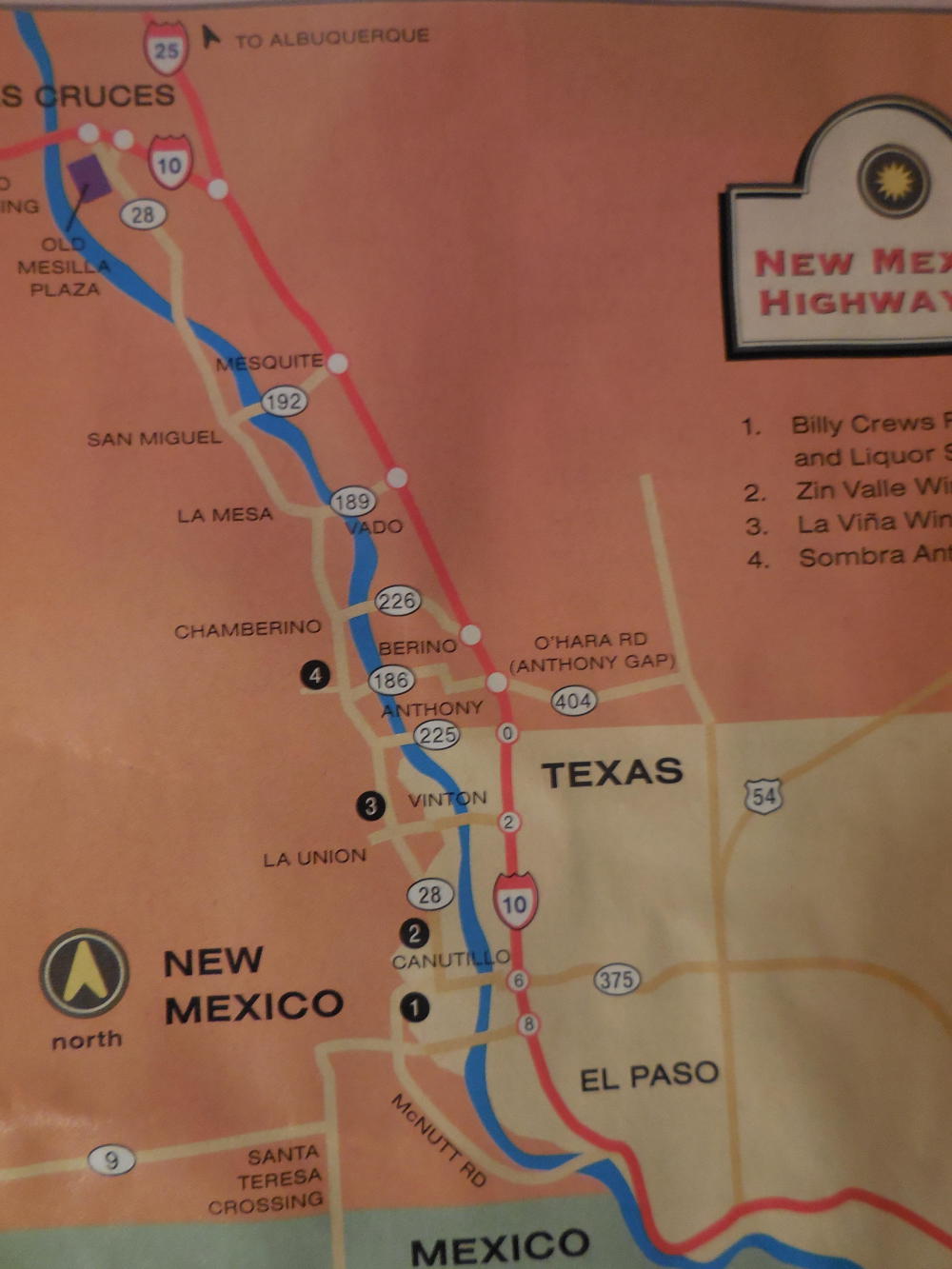 Where we were today and where we are going tomorrow. If you look at the map below you can see loop 375 anbd then a road leading to 404 through the Anthony Gap. That is how we went today. 404 then cross I-10 and the Rio Grande and reaches highway 28. 28 is a famous winery route, and leads to Las Cruces. That will be our roa for tomorrow.