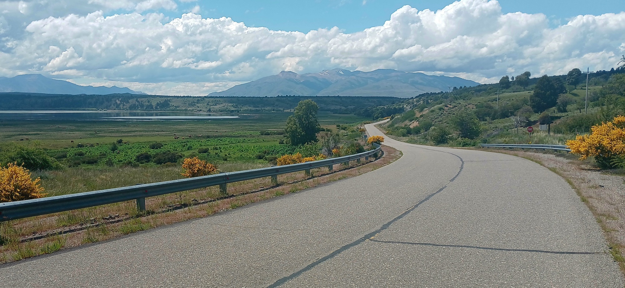 I got moving at 10, back out the long track to the road which is tarmac as I approach the southern entrance to the park, where on the hillsides all around can be seen the blackened trees of wildfires in recent years, caused predoninatedly by human carelessness. Onward the landscape is rugget bare mountains and treeless valley with a boggy pasture on the left that becomes a small lake on the far side and a little further there is a left turn for Esquel, while straight on is to Trevelin. I opt for going left as Esquel is much bigger with more services. Furthermore, the road to Esquel is more dramatic wirh a steep hairpinned descent little more than a kilometre in; then crosses an old ironbridge at the bottom, over a fast flowing river, followed by a climb and its about 10 kilometres to join Route 259 at a tee-junction, where left is to Esquel.
