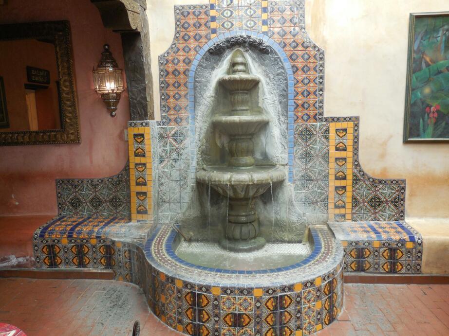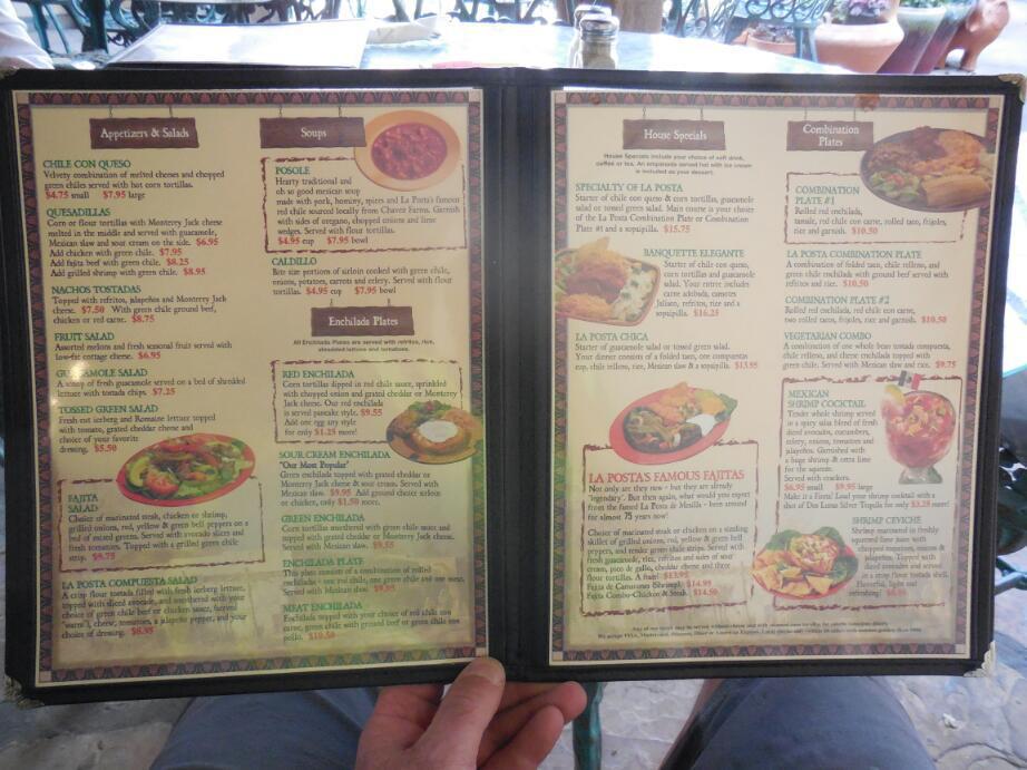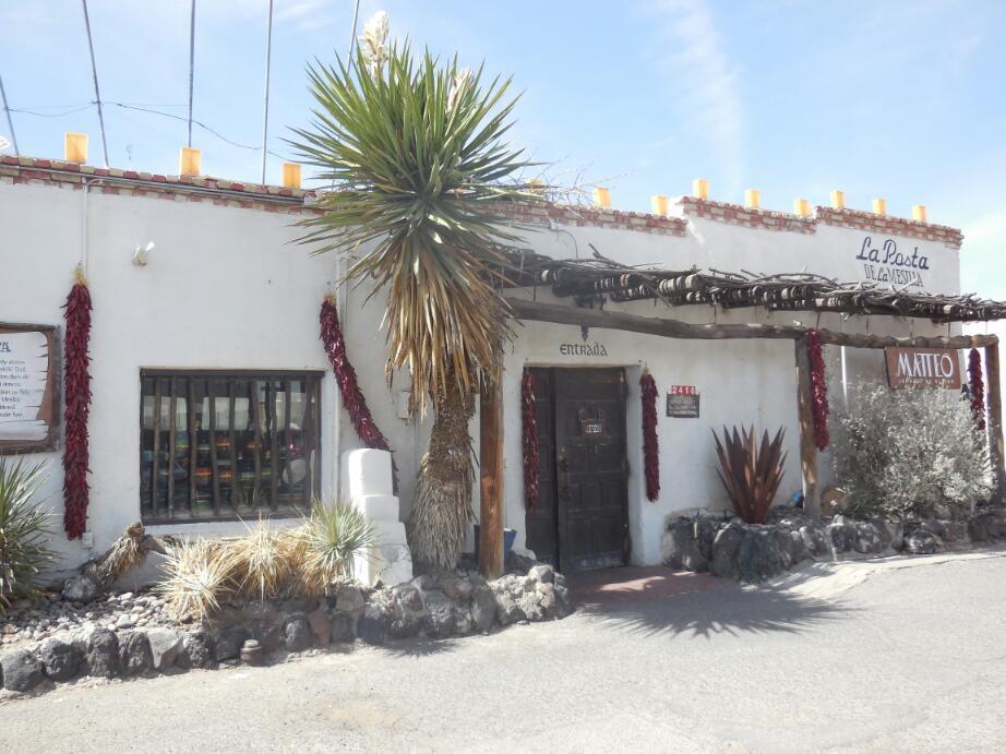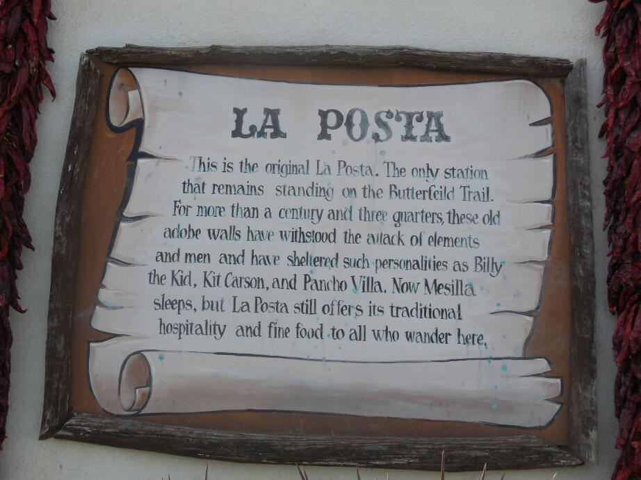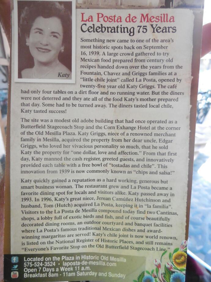 The building that made the biggest impression on us was La Posta. As the name implies, this was a sort of post office/stage coach stop in the past. a plaque on the wall claims that other than Billy the Kid, Kit Carson, General Douglas MacArthur, and Pancho Villa stayed here. The modern history of the place begins in 1939, when Katy Griggs, the daughter of an old local family, opened a restaurant in the building using old family recipes. It is said that modern New Mexico cuisine originated there. The building and restaurant there now is still owned by a branch of the family. The first thing about it is the beautiful interior, with so much adobe, tile, and plants. We got to sit by ourselves in an internal courtyard, with a huge pecan tree in one corner.