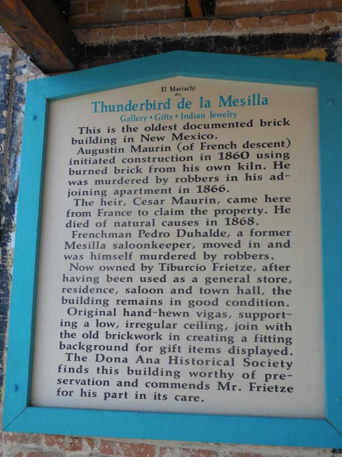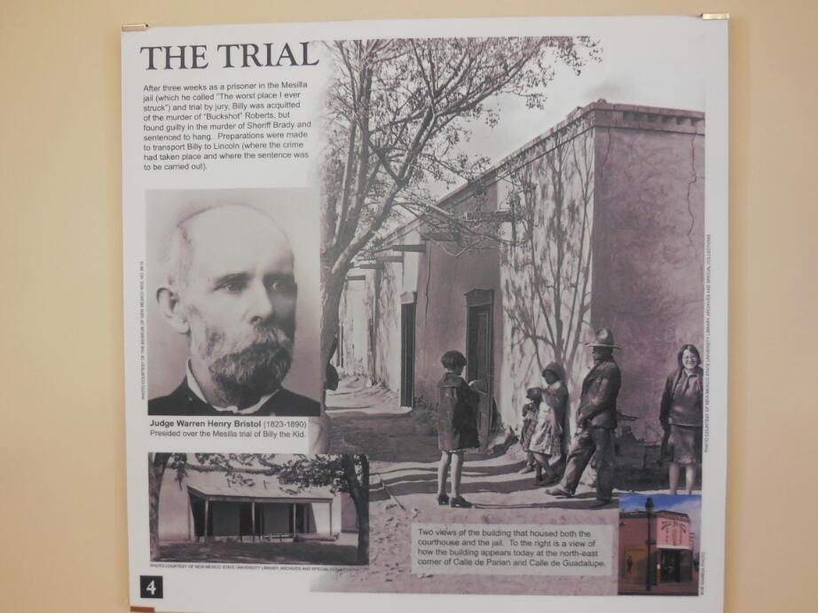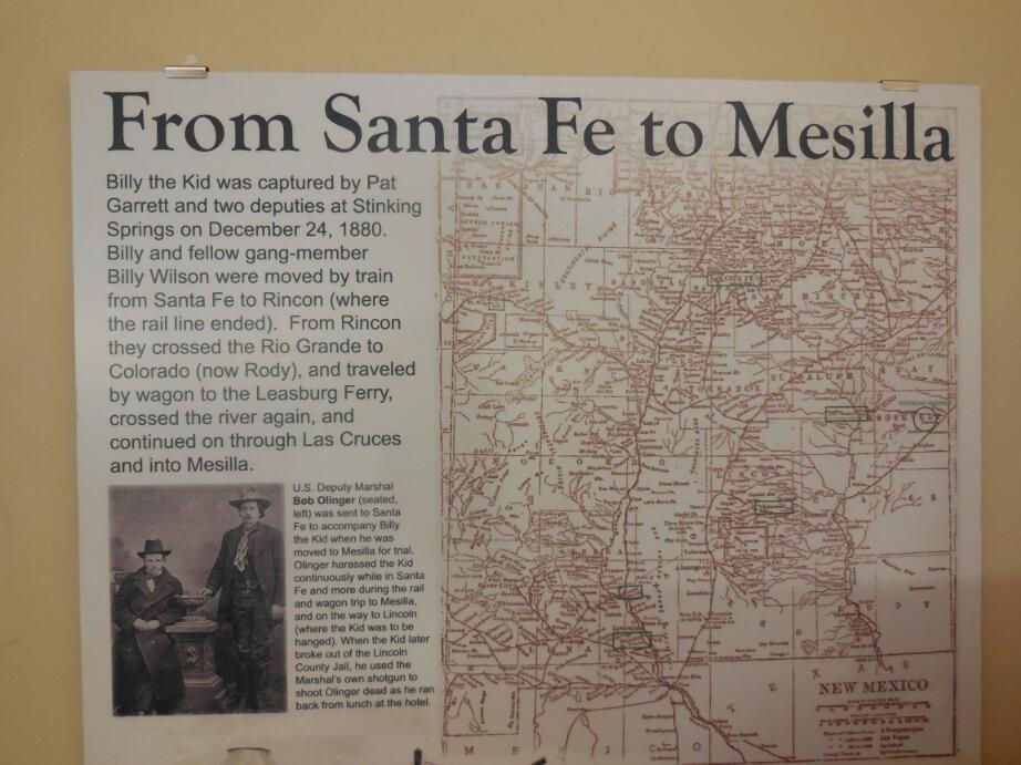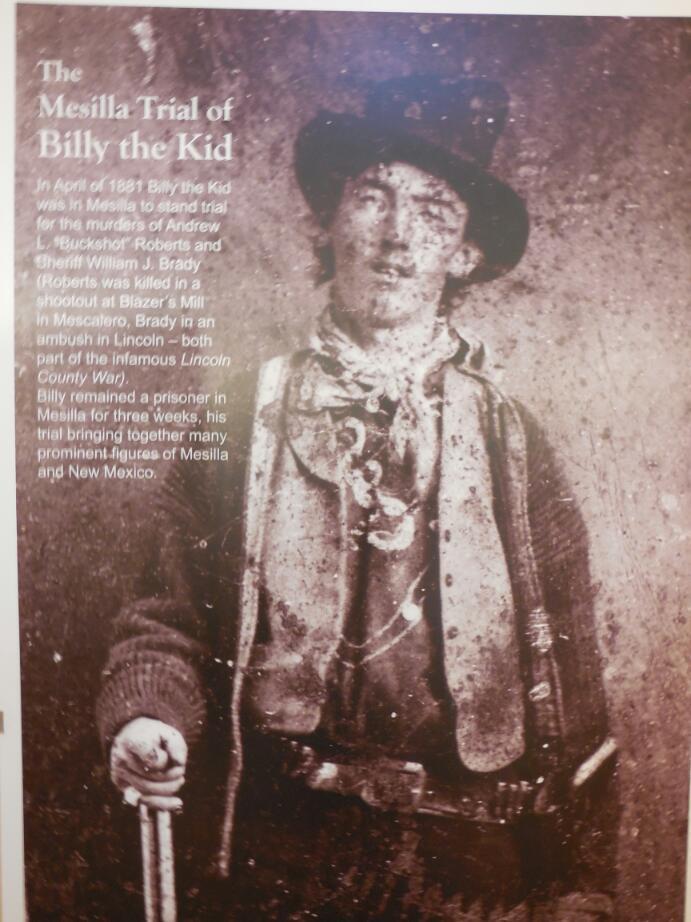 This was truly at that time the 'Wild West", featuring genuine gunslingers and frontier justice. The most famous one and the bread and butter of the tourist value of the place was Billy the Kid. Billy the Kid was accused of the murder of two men, one in a shootout and one in an ambush. He was captured at Stinking Springs, north of here, and brought to Mesilla to stand trial. The building where the trial was stands at one corner of the square. Billy was convicted and taken to Lincoln to be hanged. Billy broke out of the Lincoln jail, shooting the marshal there with his own shotgun. Billy was later hunted down and shot. He was in his early twenties.