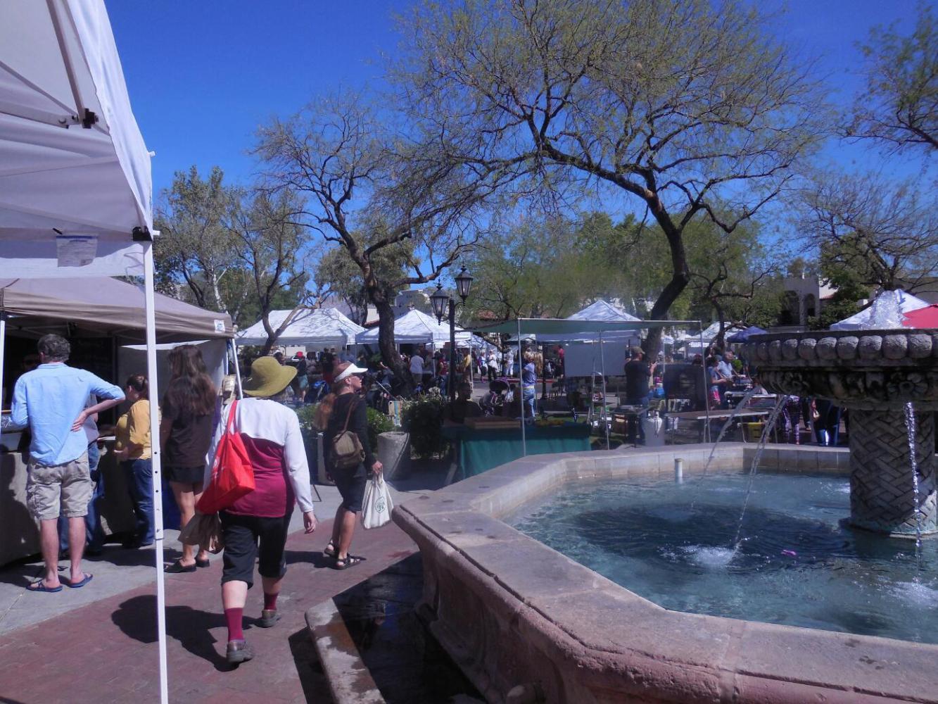 About food, we had the chance to attend one of the Tucson farmers' markets today. Here we found the lovely sense of community that you always see at such markets, a venue with shade and a fountain, plus a bike shop nearby, and though the season is just beginning, fresh tomatoes, strawberries, asparagus, cheese, bread ... the things so lacking out on the road and generally, in such huge swaths of the South.
