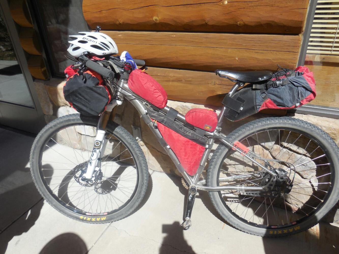 The bike's owner, Larry Bennett, came along and the usual cyclist to cyclist chat fest ensued. Larry is training to Ride the Divide next year, and he had ridden up this mountain on a rough back road! There is a bivy sack and sleeping bag in his kit. His bike and bags are custom made. He is a serious, crazy guy. We loved meeting him! Check out Larry's blog at bikepackingquest.blogspot.com