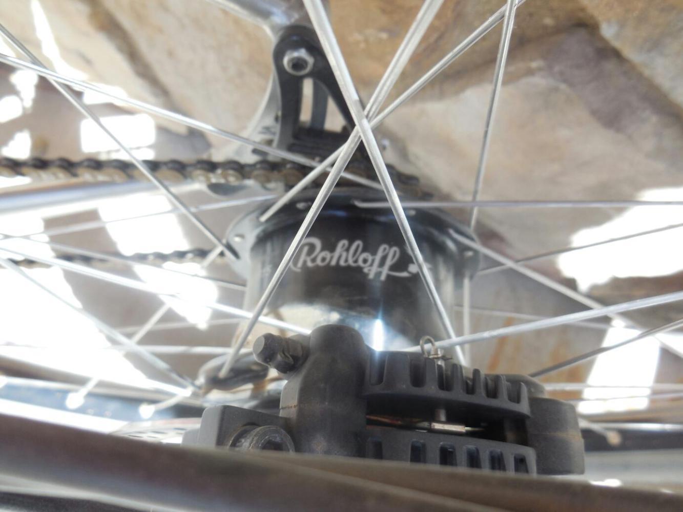 But in the village we ran into one different from the rest. We spotted his bike first. Almost a touring bike, it was laden with packs.But this was not a cycle tourer but a "bike packer". The packs don't hang off the sides, but cling to the centre line of the bike. The wheels are 29 inch, the forks have suspension, and this one had a Rohloff hub, Son 28 dynamo, and EWerk battery system.