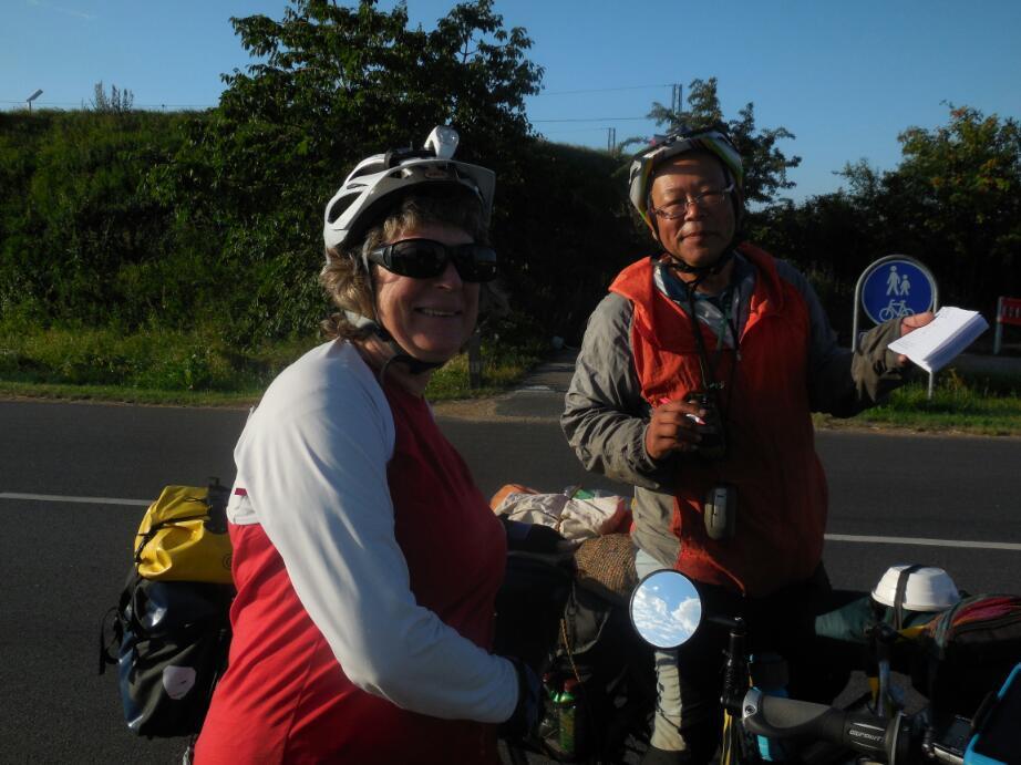 When we left the camping reception was still closed, so we failed to apologize, and happily saved about 150 kroner! Another early bird was our new friend Hironaka Hiromi, cycling from Madrid to Amsterdam. He was using non waterproof packs and an old racing bike with skinny tires and radial spokes. We felt like weaklings, with all our fancy equipment. Now retired, he had been a chemist, and consulted on mercury poisoning on reserves in Canada. Interesting!