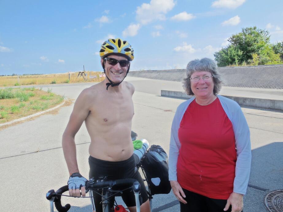 We also talked to the only racing type guy on the paths who would slow down for long enough. He said that he would normally go on the paths at 30 kph, but in speed trials could go 60. Downhill in the Tour de France speeds could easily be over 100. On the other hand, in a peleton where no one wanted to take the lead, they could all dodder along at 10. After a while the fellow had to go, and chuckled at my amazement that he could truly beat our current speed:13!